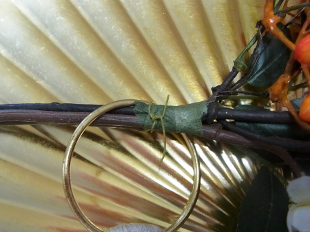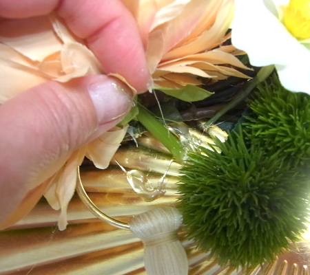 | 花束がプレートに固定されたことを確認したら、とおしてあった房リングを好みの位置で花束の茎にワイヤーで固定します |