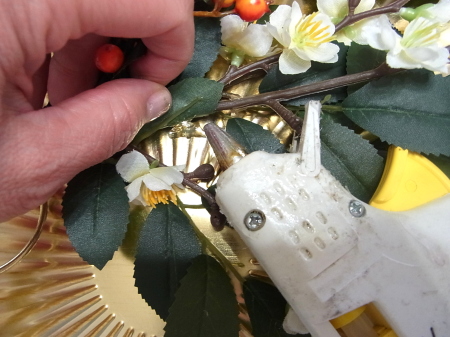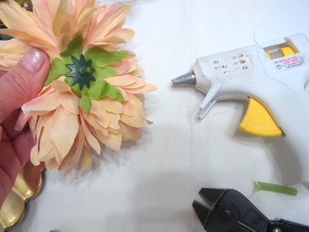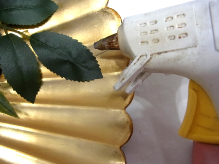 | 花束の角度がきまったら、タッセルは通したまま、プレートに接地している部分をグルーで固定します。 注意 ゴールドプレートはとてもよくグルーがつきます。一旦ついたらなかなか剥がれません、くれぐれも、グルーをお皿にたらさないようにしましょう。 もし間違ってつけてしまったら花材の 根元でカットしましょう。無理やり剥がすと金箔ごと取れてしまうことがあります |