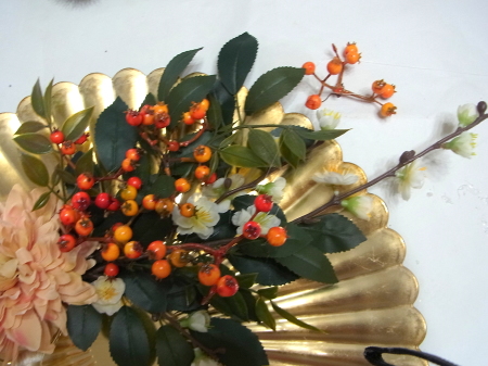 | 間引いた南天や、榊、マムの葉も必要に応じて、お絵描き感覚で使ってみましょう ポイント メリハリがでるように花材のあるところと、無いところをしっかり作りましょう |