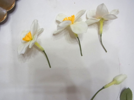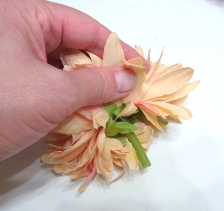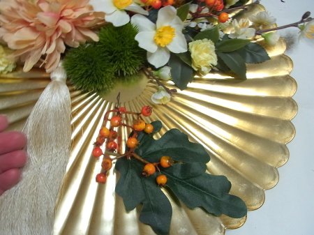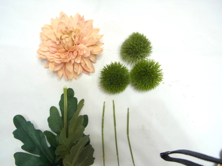 | マム、グリーントリュフをおいてみて、タッセルのリングが隠れるようにレイアウトを決めます グルーではりつけていきます。 サンプルはマムをリングの中央において、リングを隠しています 写真のマムは茎がありませんが、茎は3センチほどつけておいてください。 茎はプレートに固定するときに重要です。 |
