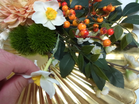 | 花束をプレートにのせて、固定したい角度を決めます。 忘れずに↓ このときタッセルをくぐらせておきましょう |