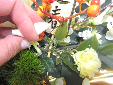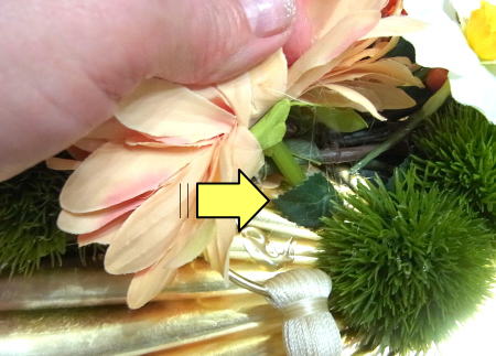 さらに、マムの茎の接地面に、榊の葉っぱシール(矢印)を上からはりつけます。 さらに強硬に固定します。 |
