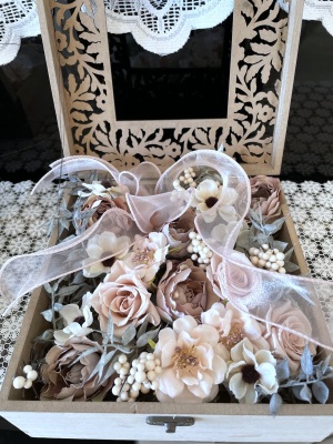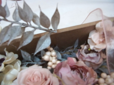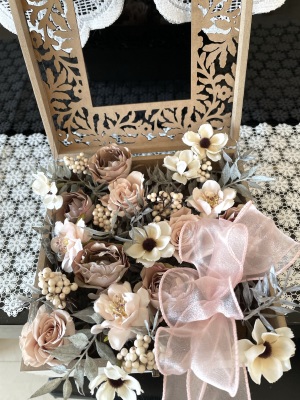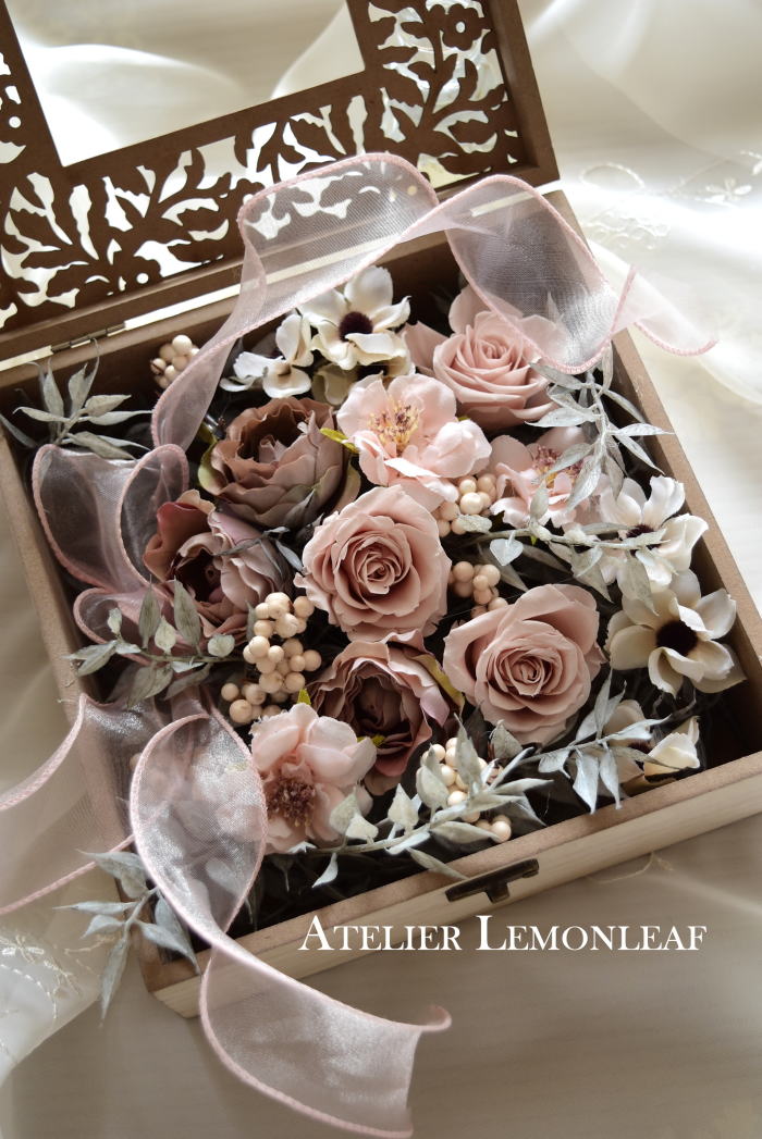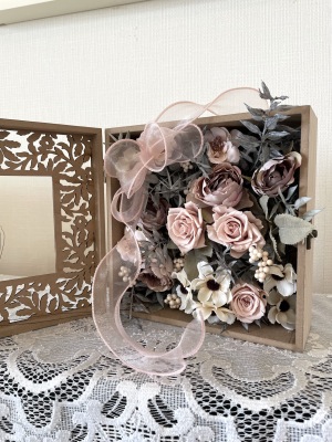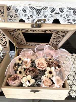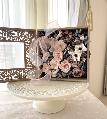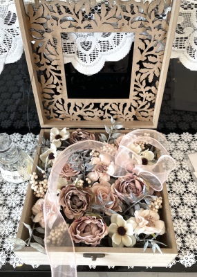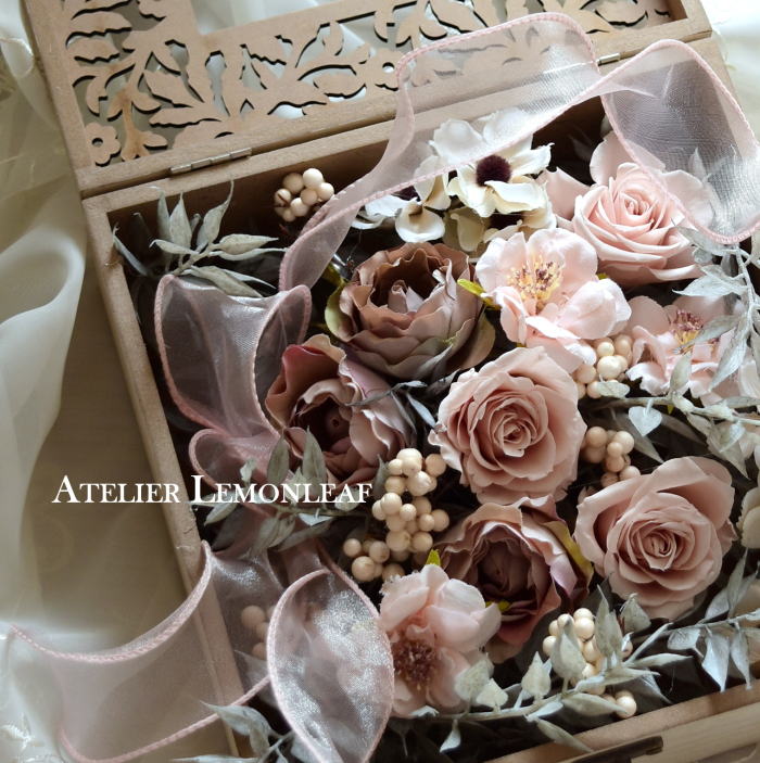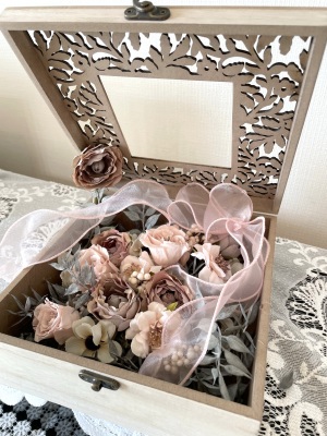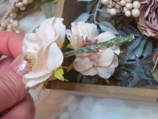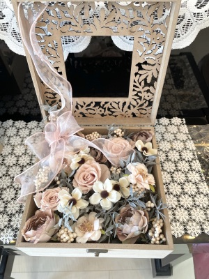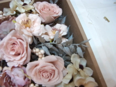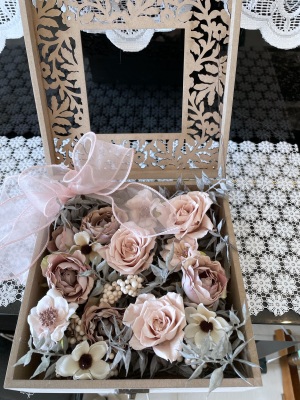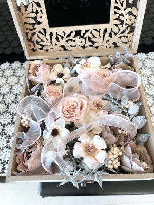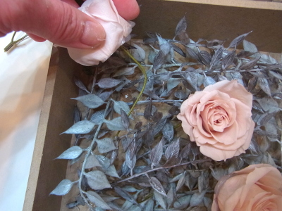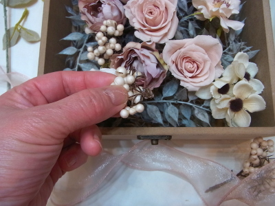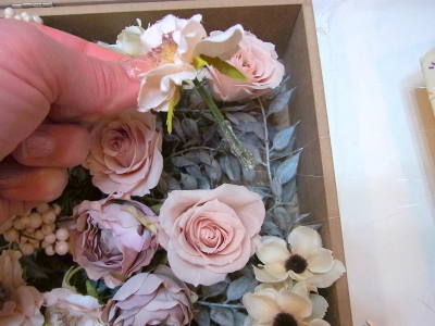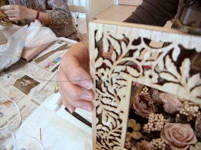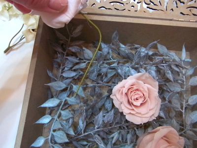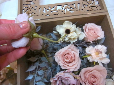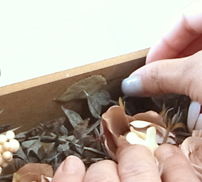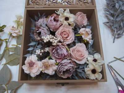 | ポイント メインの3つのバラ(プリザーブド、バラ、リリアンローズのレイアウトがきまったら、固定していきます。 花材はたっぷりあるので、全部使う必要はありません。残ったものは蓋に飾ってとめることもできます。(蓋にも飾っている生徒さん作品をみてみてくださいね。) 。好きなお花からつかいましょう。 |