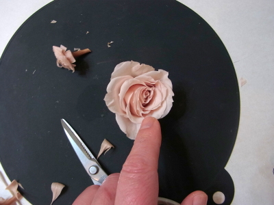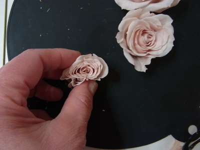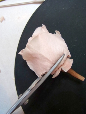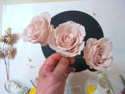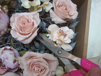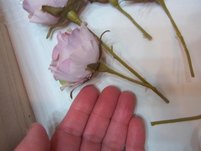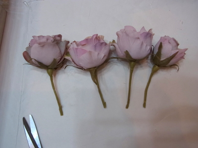 | バラの花を準備します。全ての花を茎を5~7センチ程度にカットします。 | |