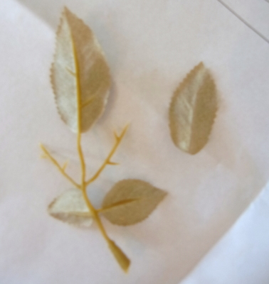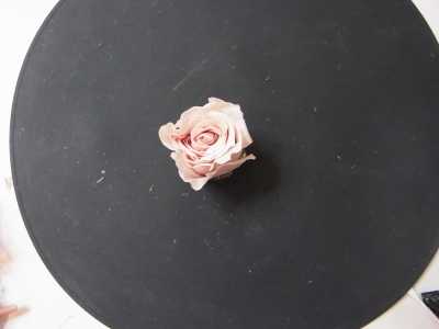 | 葉先を魅せたいところに、グルーをつけて入れ込みます。 ピンピンと飛び出す尖った葉先が丸いバラと対照的でそれぞれが引き立ちます。 |