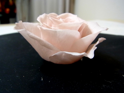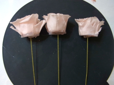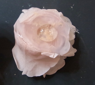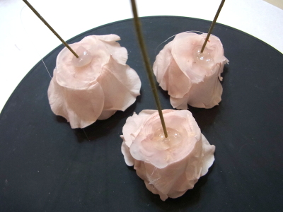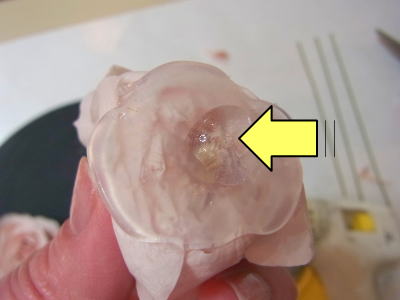 | 茎をつけます。完全に冷えて、グルーが固まるまで待ち、マットからはがします。裏面はこのようにつるつるです。 | |