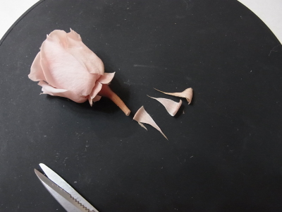 | プリザーブドフラワーを出し入れするときは、花弁をもたずにハサミなどでワイヤーの茎をはさんで上下しましょう。 | |