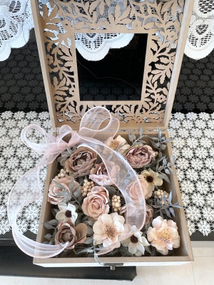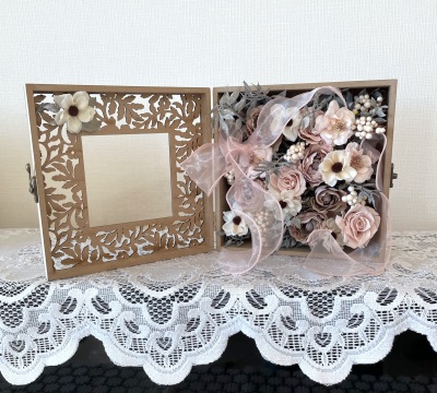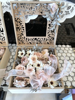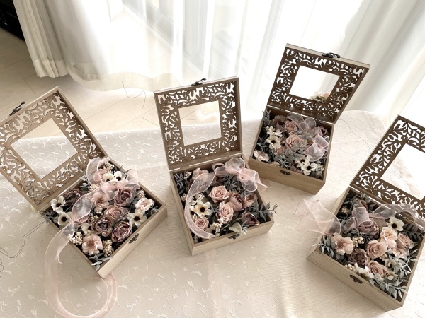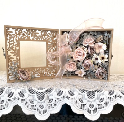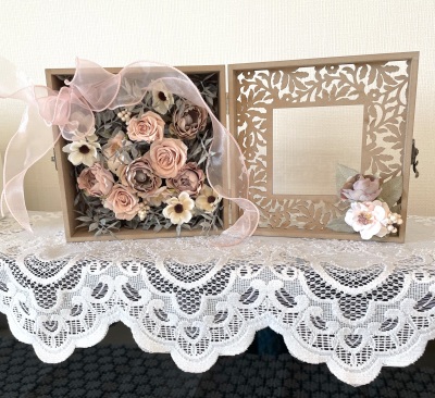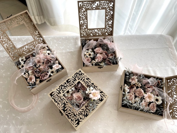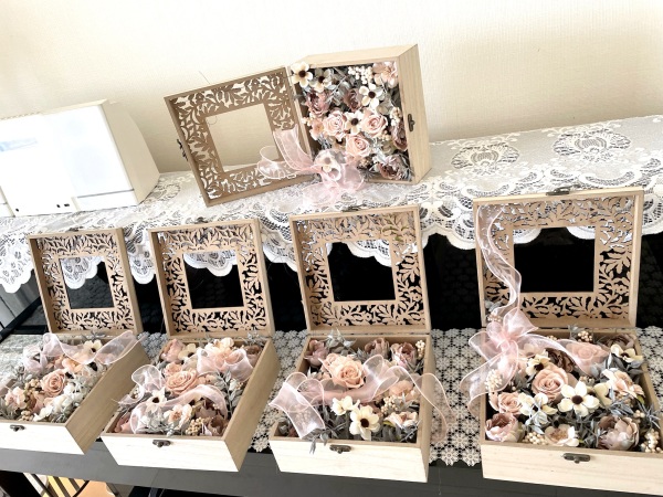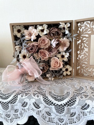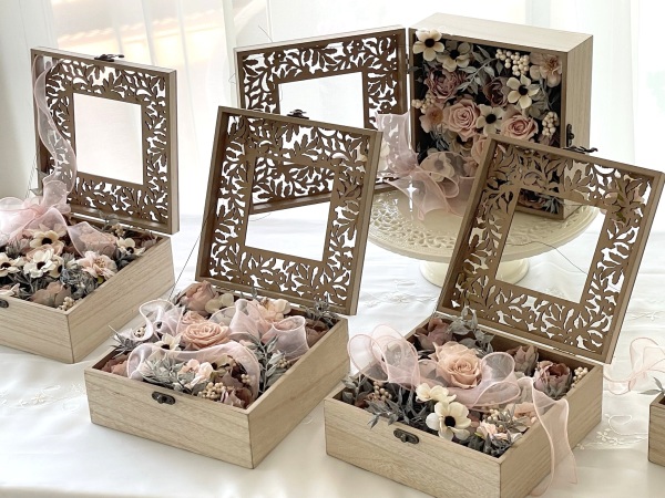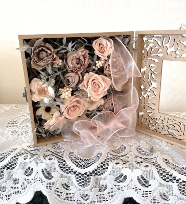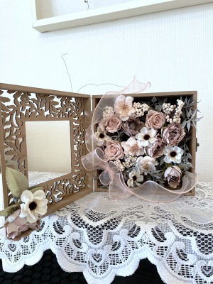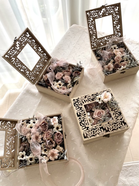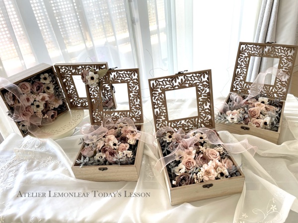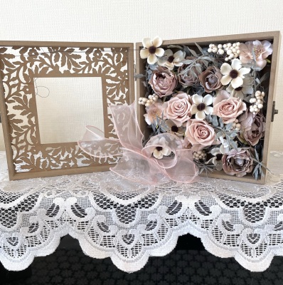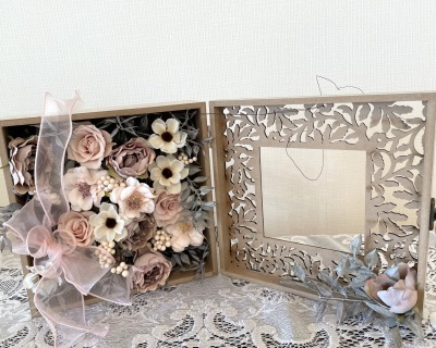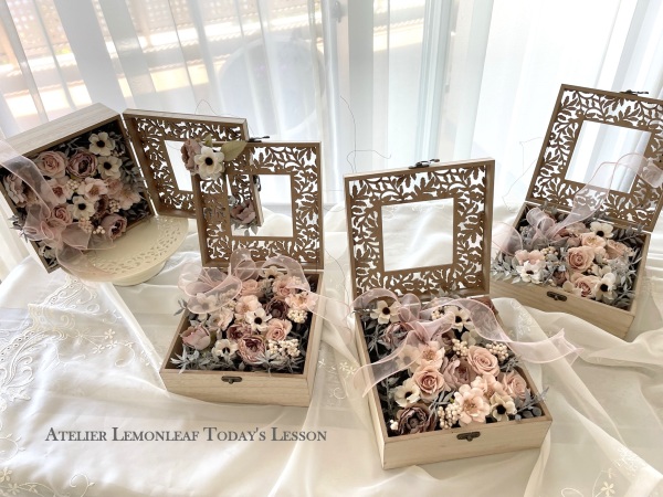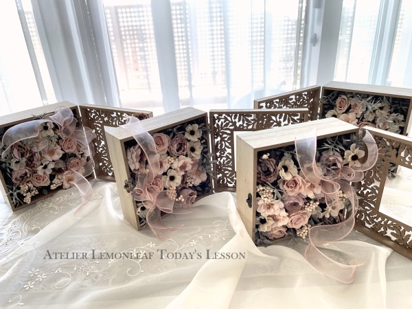 | お元気ですか? こんにちは さわやかな季節になりましたね。 今月はとても透かしが綺麗なレーシーボックスへのアレンジです。では早速、始めましょう。 プリザーブドフラワーの開花をしていきます。 くわしくはこちらで公開しています https://youtu.be/eAkgYd7R_LE 開花にはシリコンマット(鍋敷きなど ホームセンター、100円ショップなどで販売しています)をご用意ください、 お持ちでない方は開花させずこのまま、茎にグルーをつけて、でアレンジしてください。デザインに影響ございません。 額を全部とります 写真のように額のカーブの少し上、直線になるところをカットします。 |