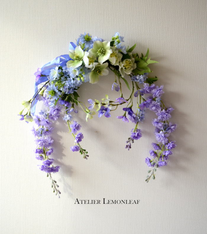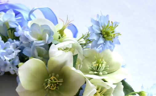 仕上げに、ニゲラ、小分けにしたスノーボール、葉をを添えます。