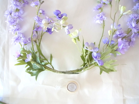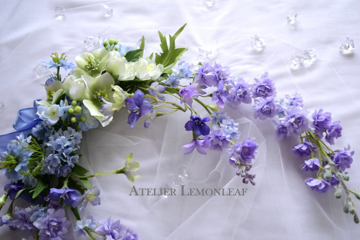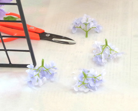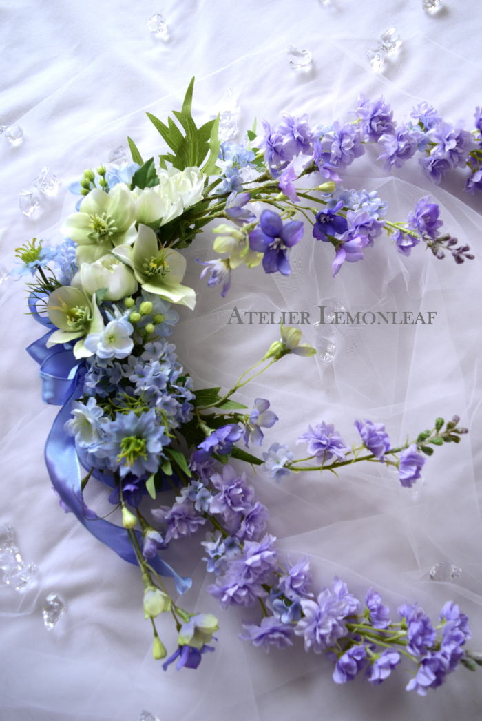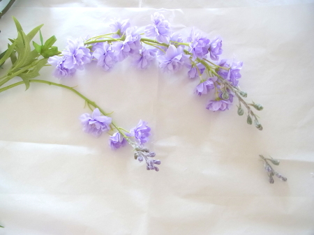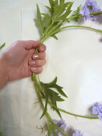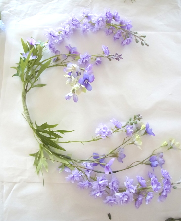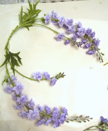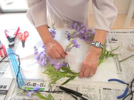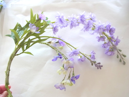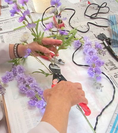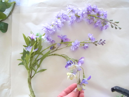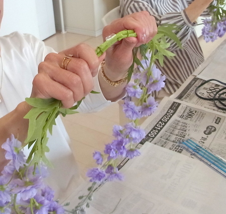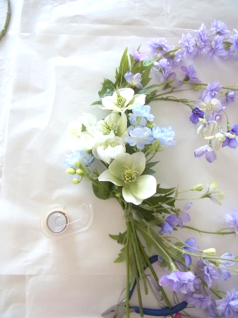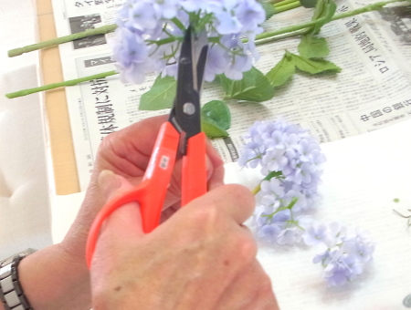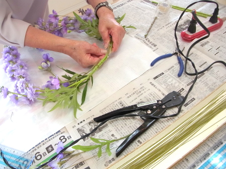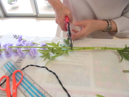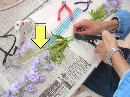 私はクレセント型の上側にくる方の デルフィニウムのつぼみの先端をカットしています。