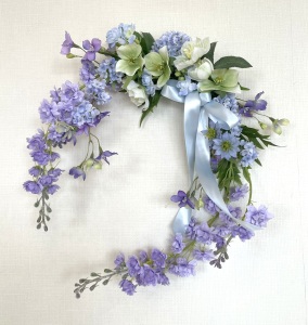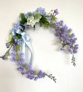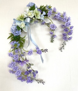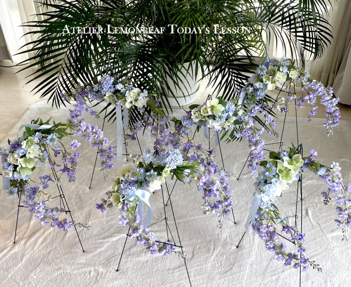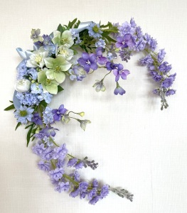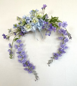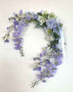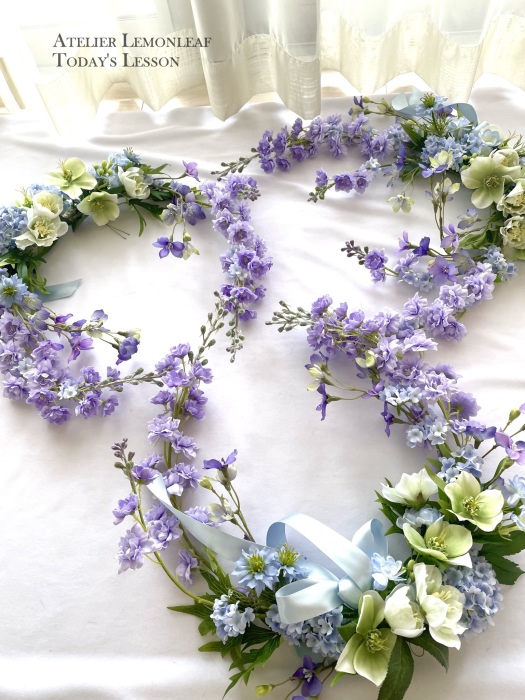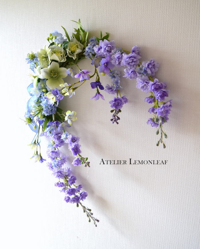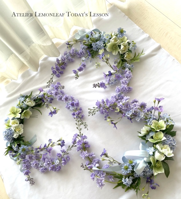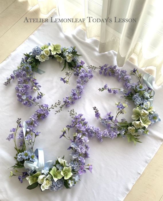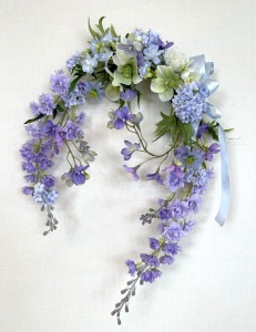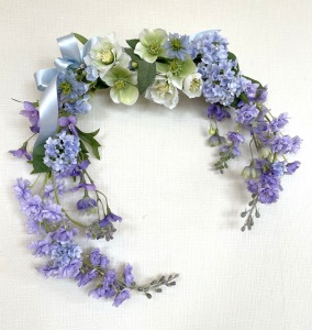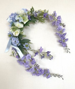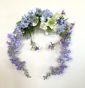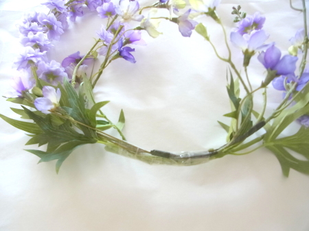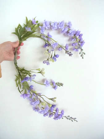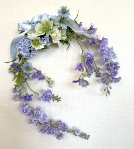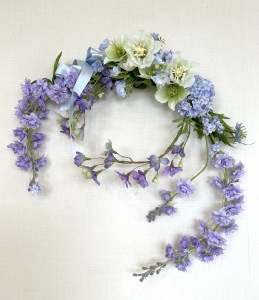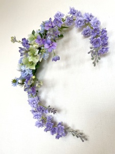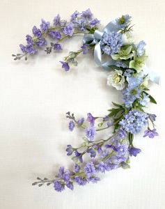 私はクレセント型の上側にくる方の デルフィニウムのつぼみの先端をカットしています。