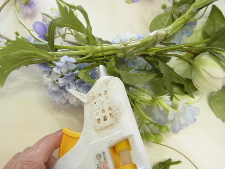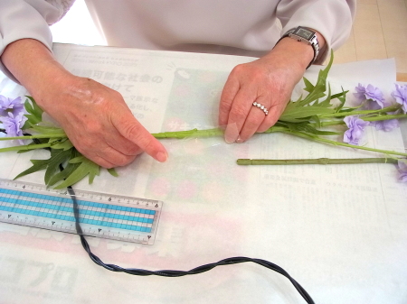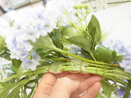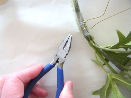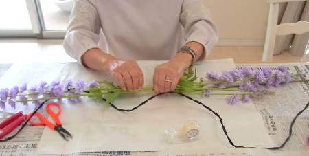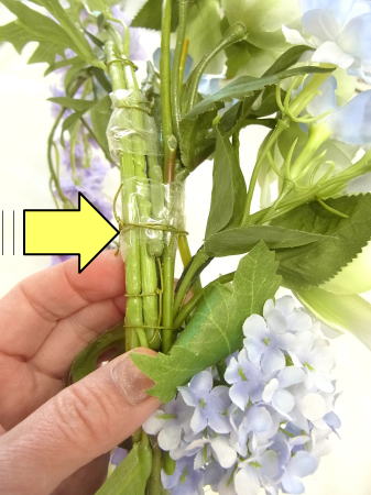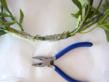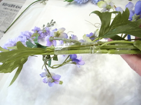 茎をセロテープでとめて、上からワイヤー1/2をかけます。