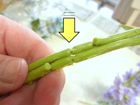 束ねるとき、上下しずらいのと、手元がダブつくので葉を落としてすっきりさせます。(葉っぱは取っておいてくださいね)