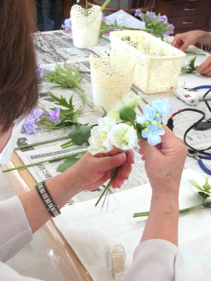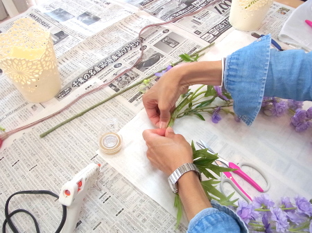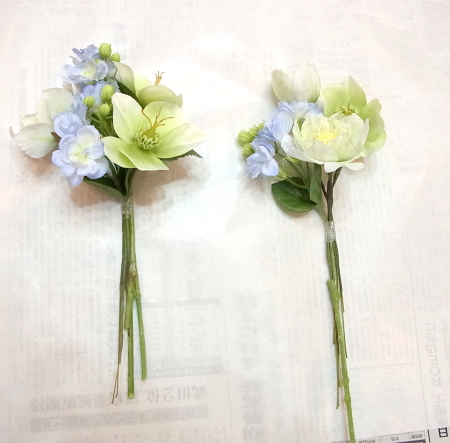 お好みの組み合わせで、大小二つの花束にします。セロテープでまとめます。 |