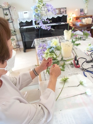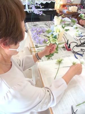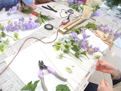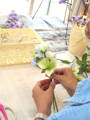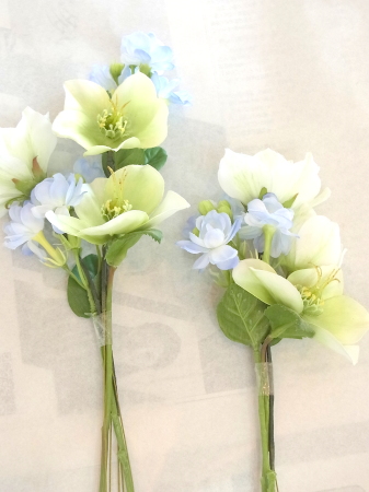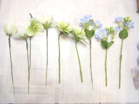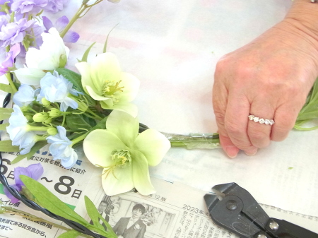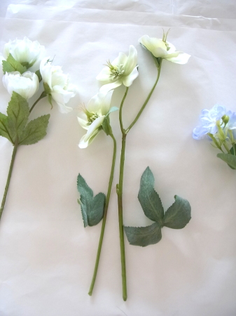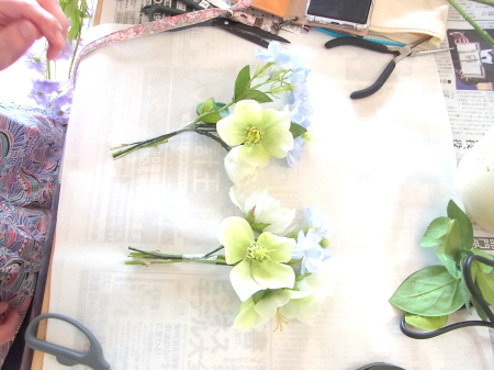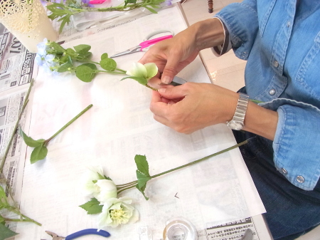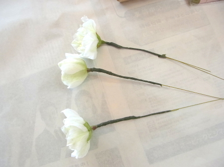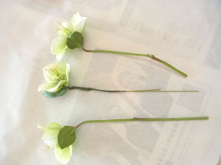 白い方のクリスマスローズは全部 ワイヤーがはいっていないので、3輪とも摘まめるくらいにカットして ワイヤリング、テーピングします |
