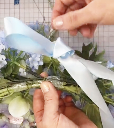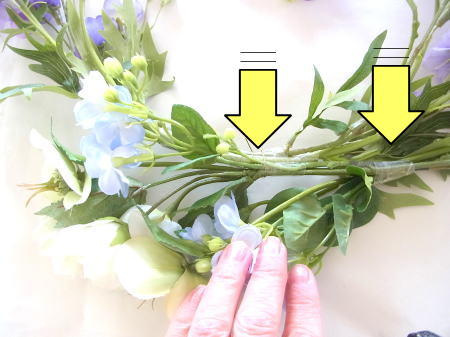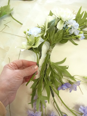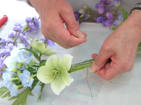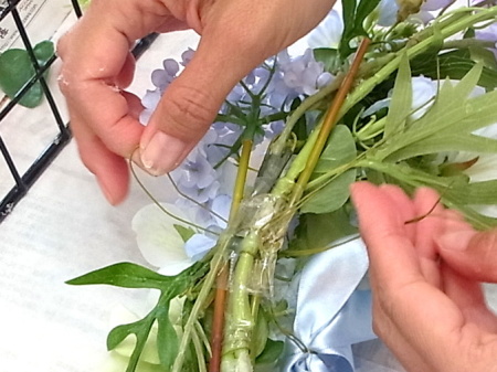 ボディに縦にならべるように、大きい方の花束から順に、次に小さい束を、ズラしながらワイヤーで固定します。