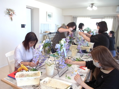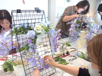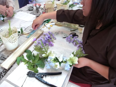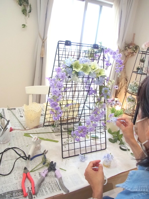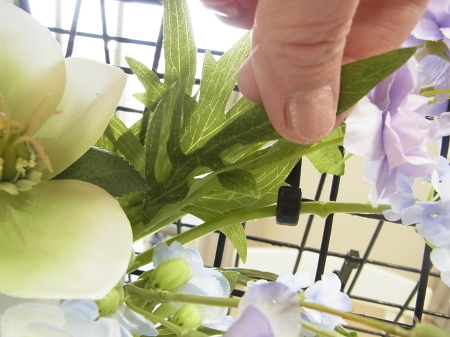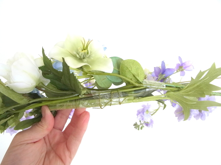 軽い花材はそのままワイヤーでもとめてもOKです。 |