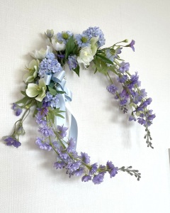 スノーボールは球体なので、固定してみて、アレンジの裏側になっているお花は カットして移動、好きな場所につけてみましょう。