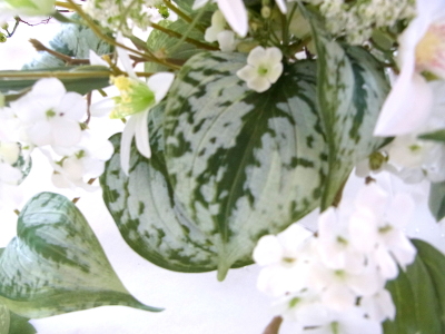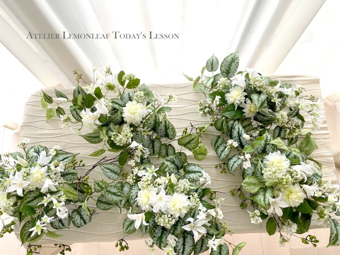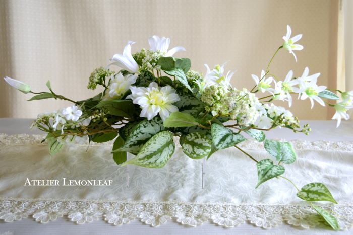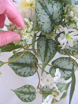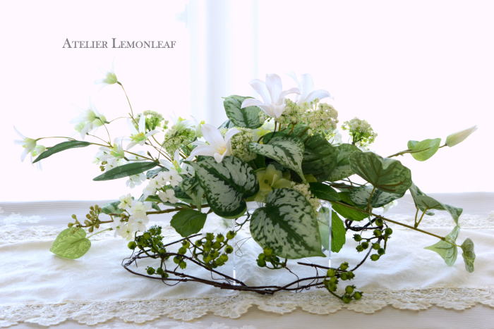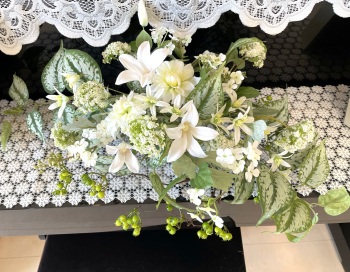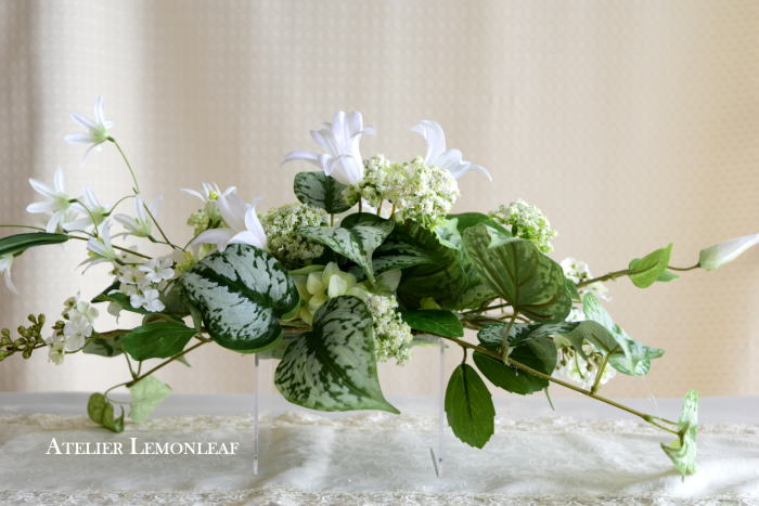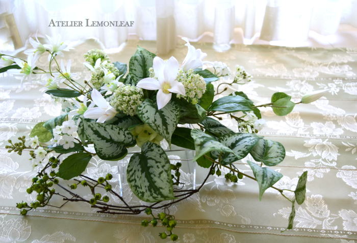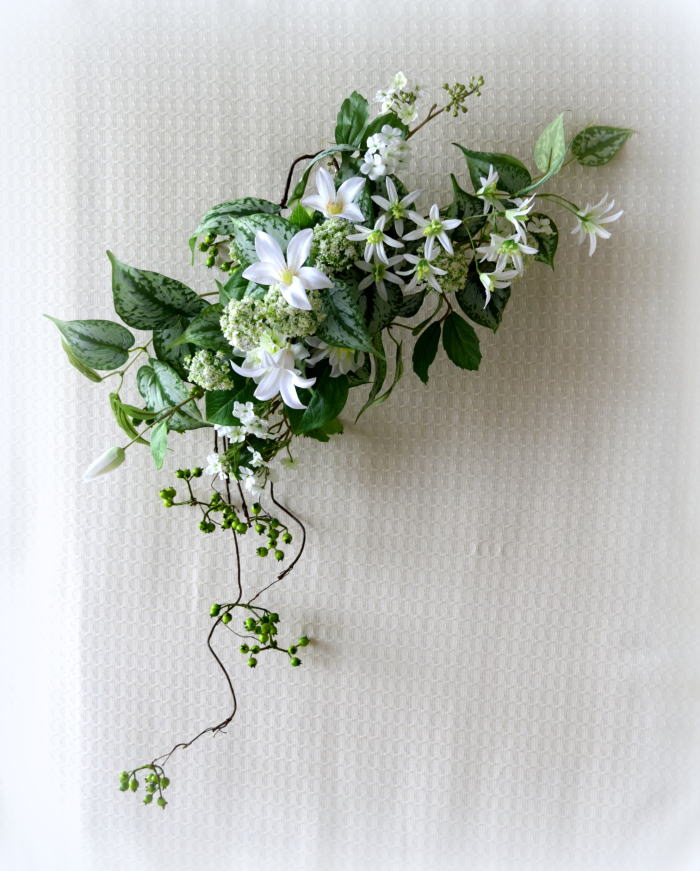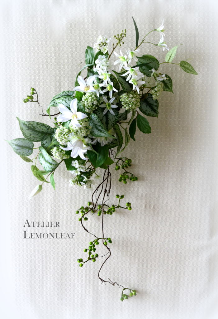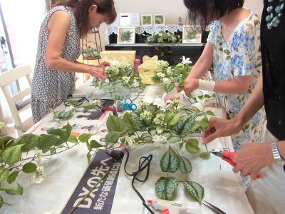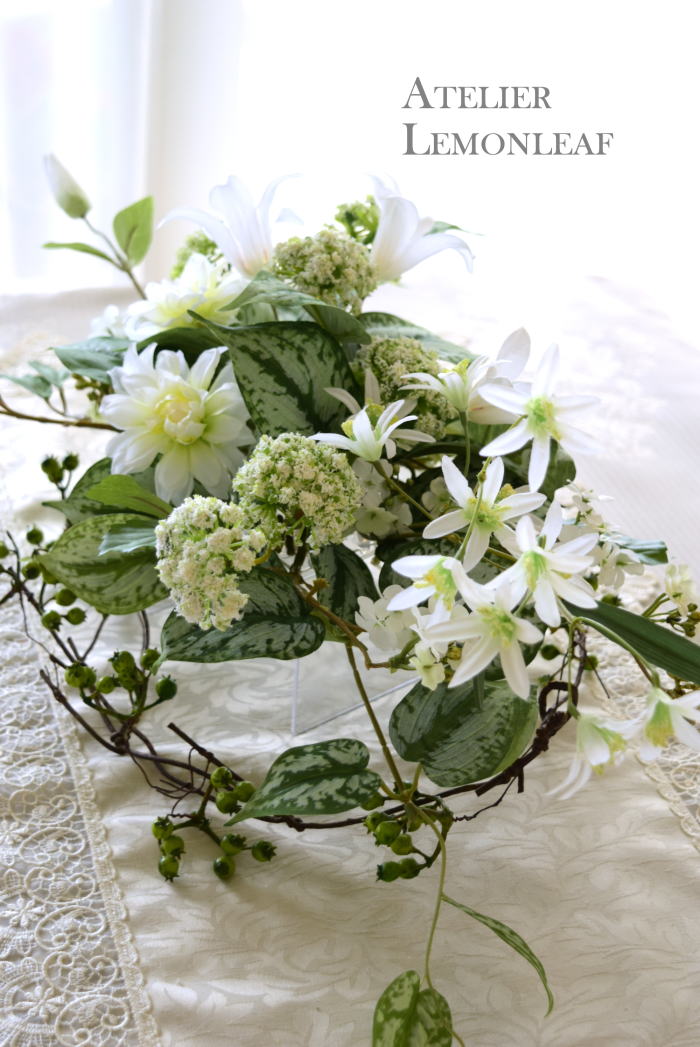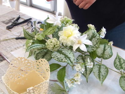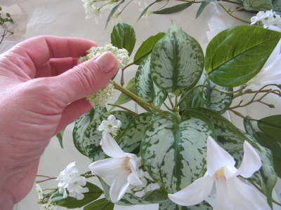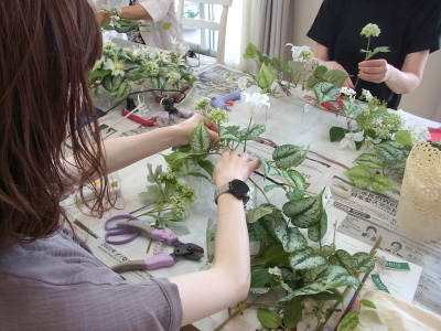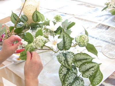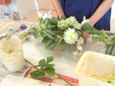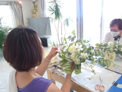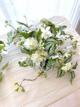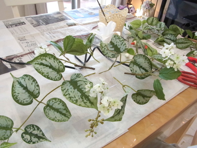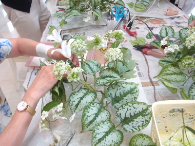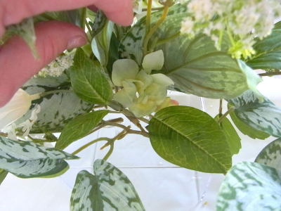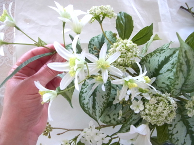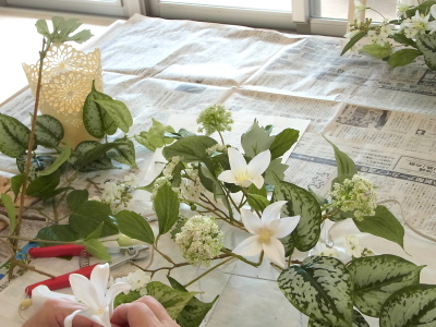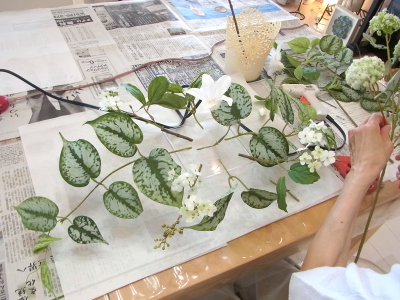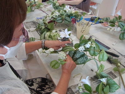 | さらにクレマチス、アンジェリカの足元、中央に葉もたします ポイント ご自分の正面ばかりアレンジしているとバランスがとれないので、前後ひっくりかえして、お花をいれて全体をチェックしましょう |
