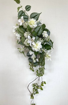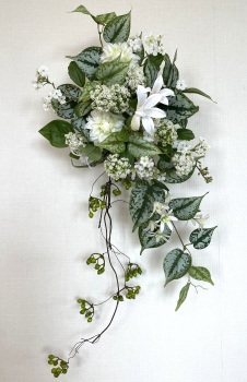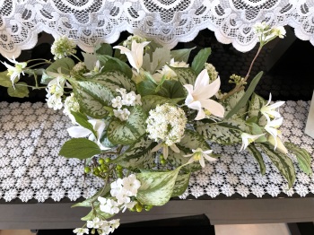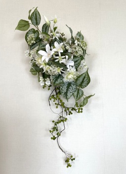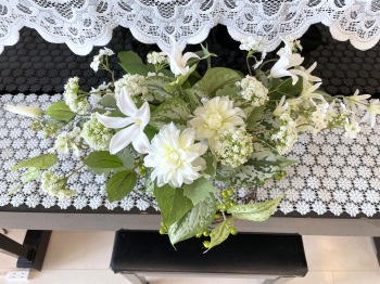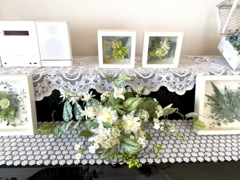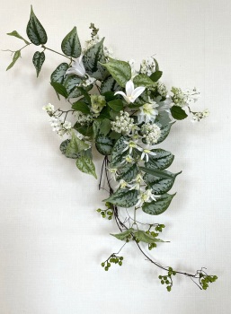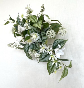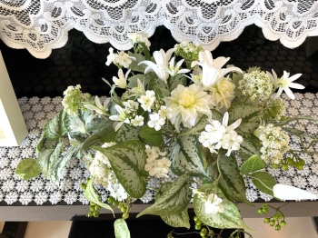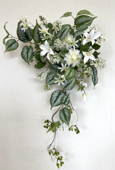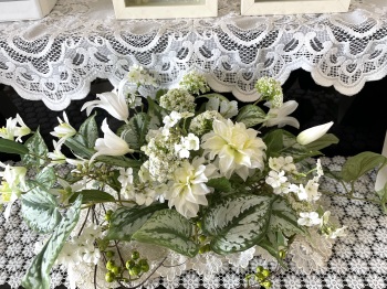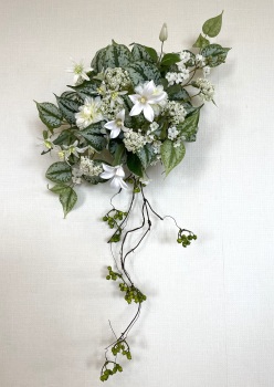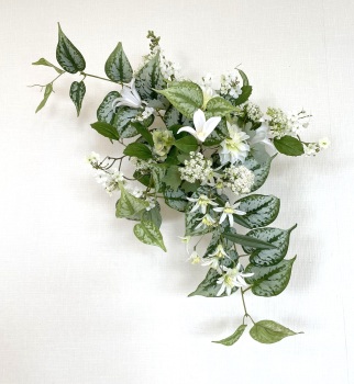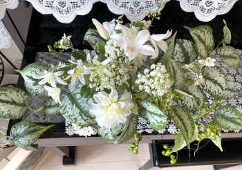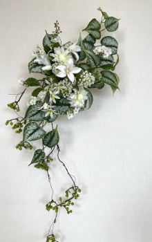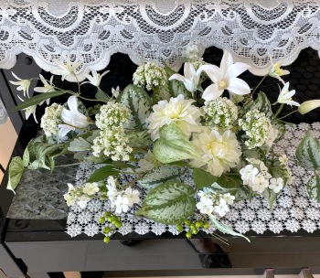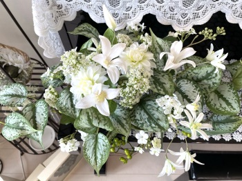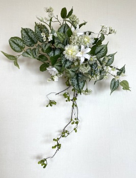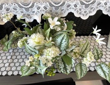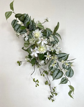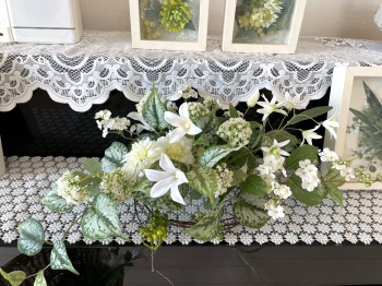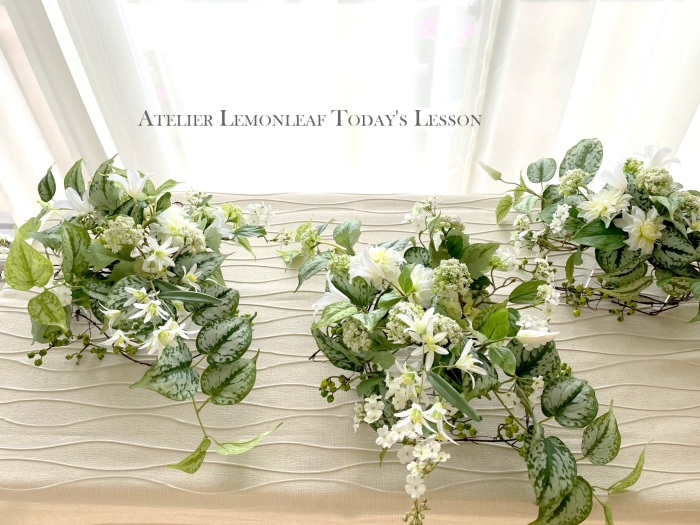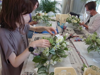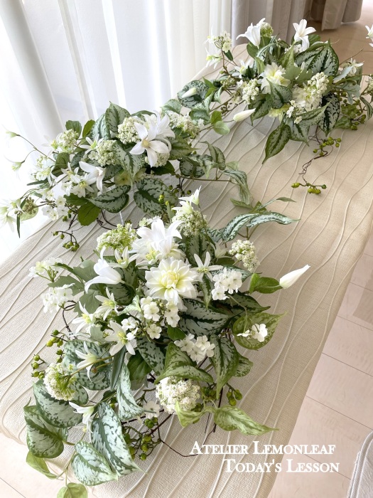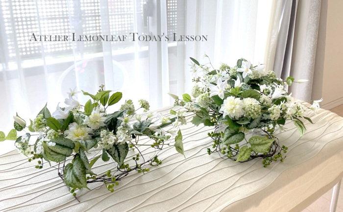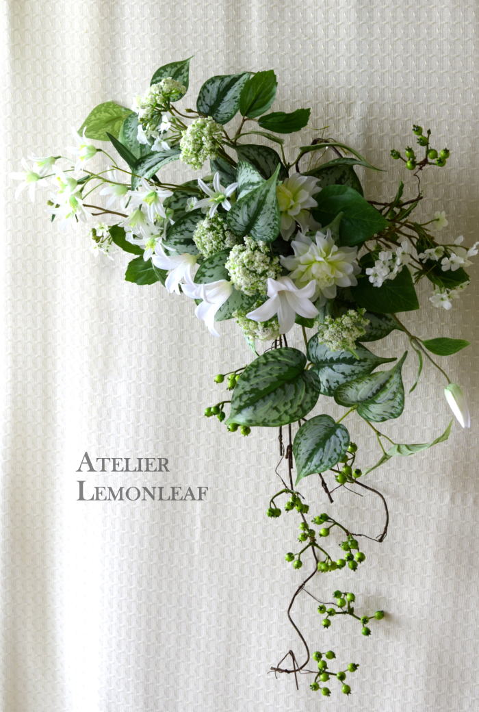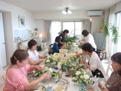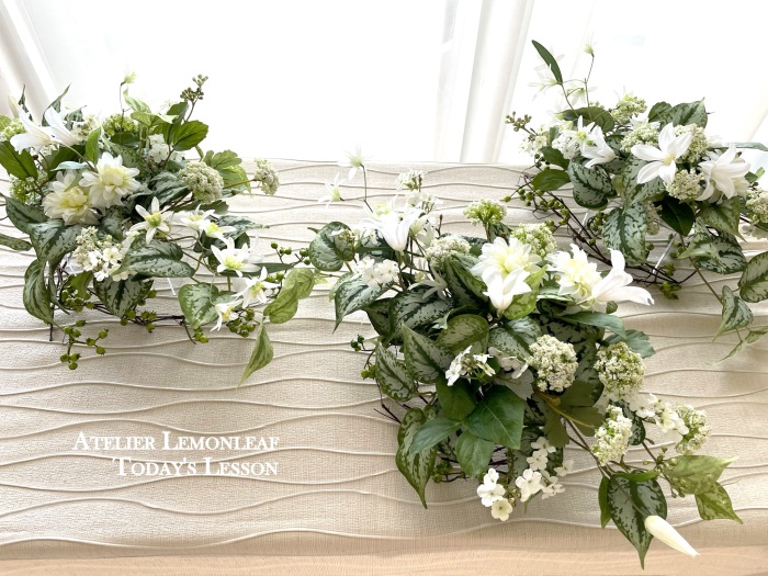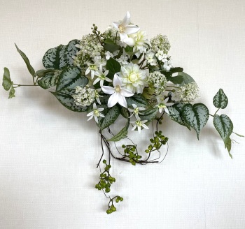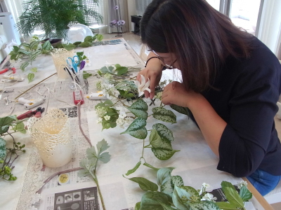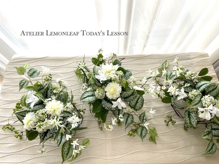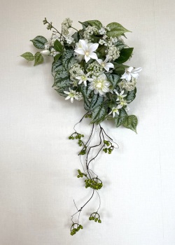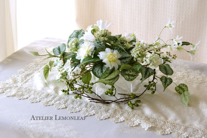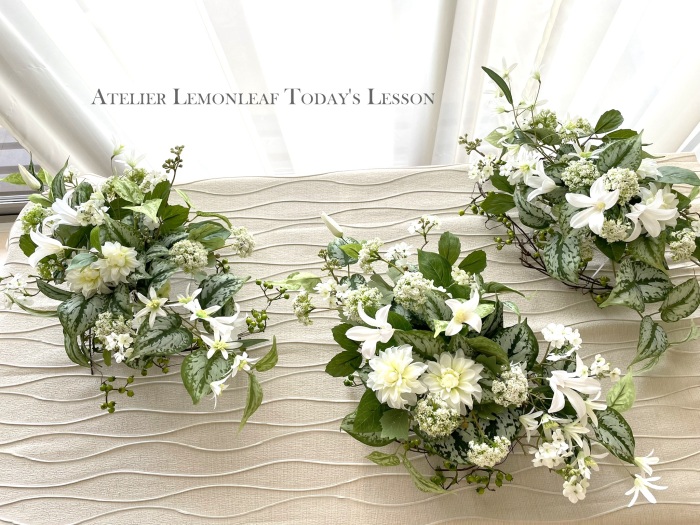 | さらにクレマチス、アンジェリカの足元、中央に葉もたします ポイント ご自分の正面ばかりアレンジしているとバランスがとれないので、前後ひっくりかえして、お花をいれて全体をチェックしましょう |