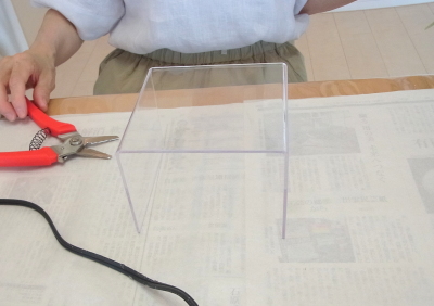 | 下の方で、脇から出したいときは L字に折らずにそのまま台に張り付けます | |