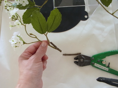 | このクレマチスの茎をL字におり、アレンジの高さを決めます ポイント ここから先中央に、立たせたい花材は原則L字に折ってつけます。だんだん花材が混んでくると、そのまま挿しこむだけでつけることができます。 |