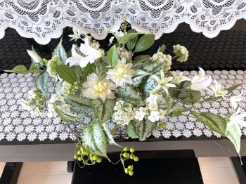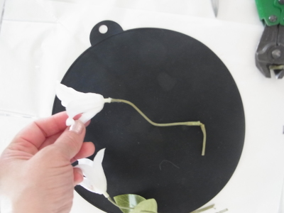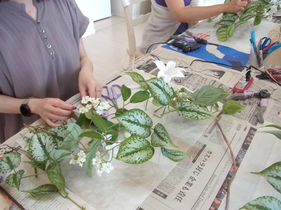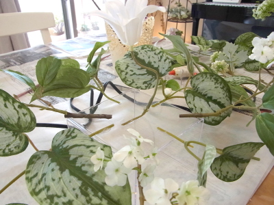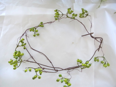 | テーブルに飾る時は実の先端を絡めて輪にします。アレンジを真ん中にいれます。 | |
