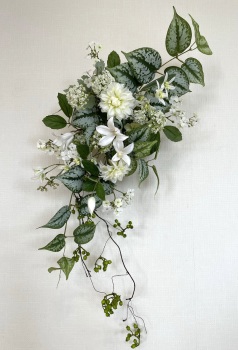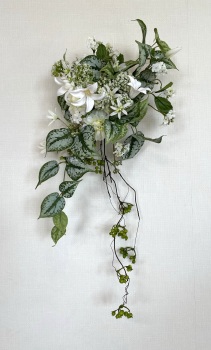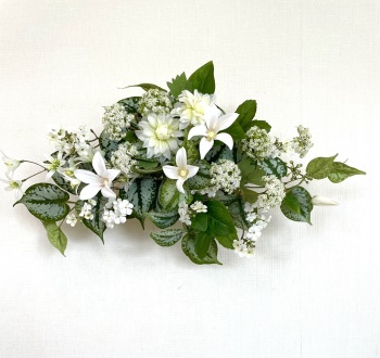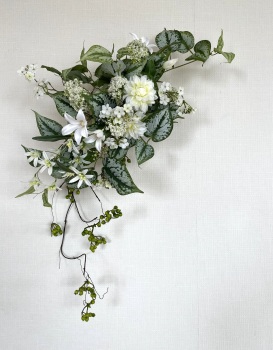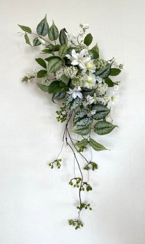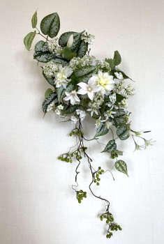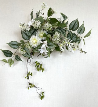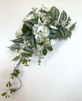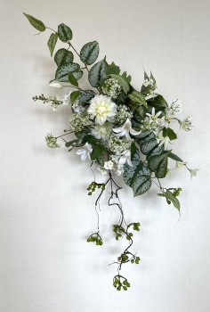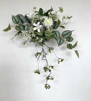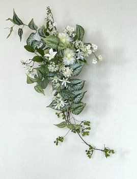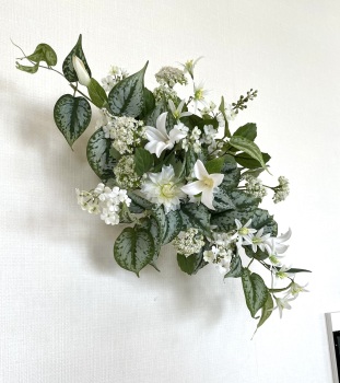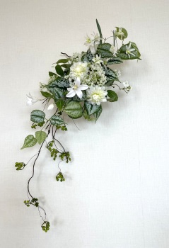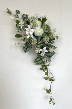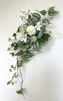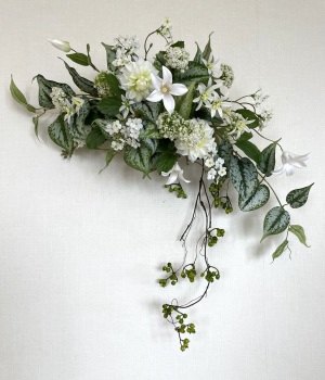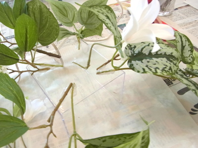| 中央に留めたいときは、L字に折って張り付けます。角度はお好みで。 ポイント 最初にきめたクレマチスの高さを追い抜かないようにしましょう。 同じ高さの花材が並ぶとポイントが散漫になってしまうので注意しましょう。大きく越えた場合は、こちらをトップとしてもOKです。 |