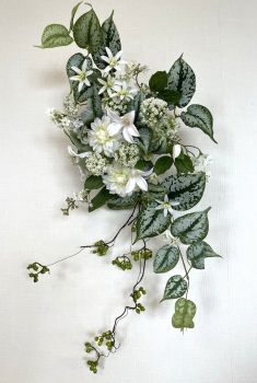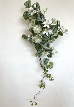 | 残りのクレマチスを二輪添えます。 2対一 または3角形にすると綺麗です。このとき最初に決めたトップを追い抜かないようにしましょう ポイント つぼみは、全体が見えてから、仕上げにいれるといい位置が見つかります。 |