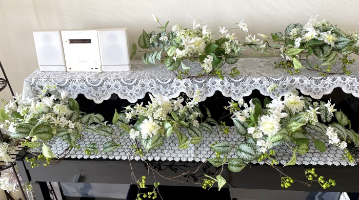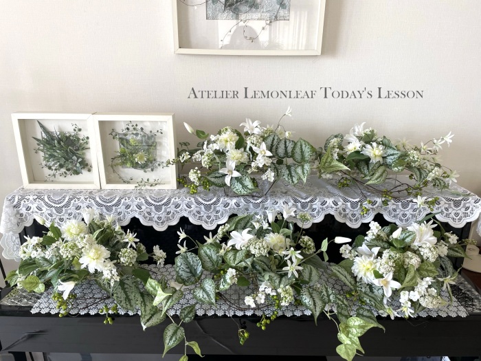 こんにちは 暑い日が続きますが、お元気でお過ごしことと思います。(^^) ふんわり浮かぶ 涼しげなアレンジを お楽しみいただけたら嬉しいです それでは 早速はじめましょう♬ まずスキンダブサスパインを小分けにします |