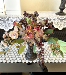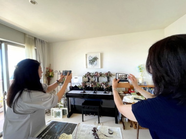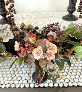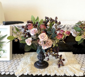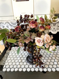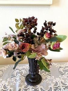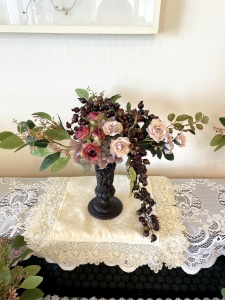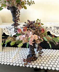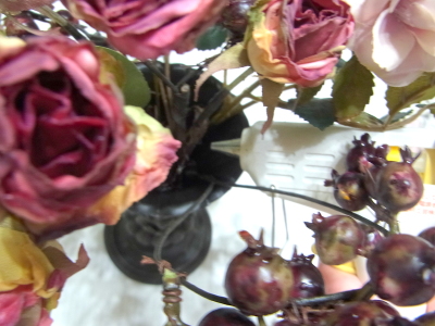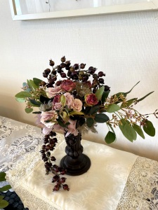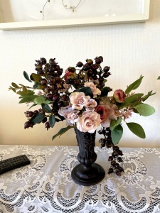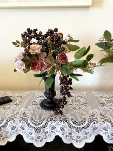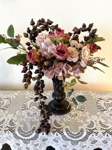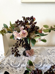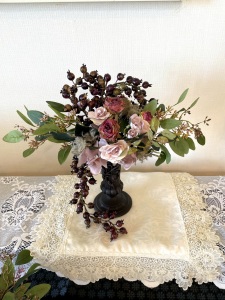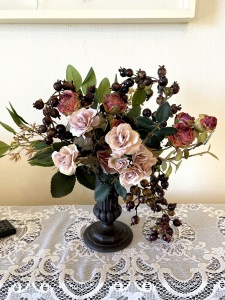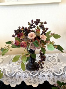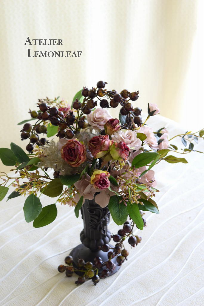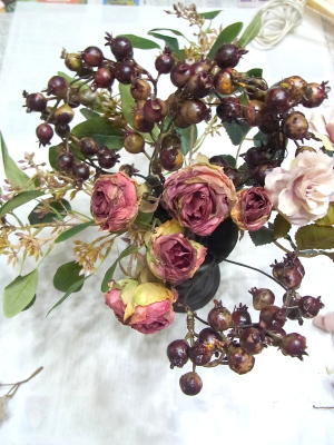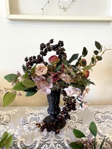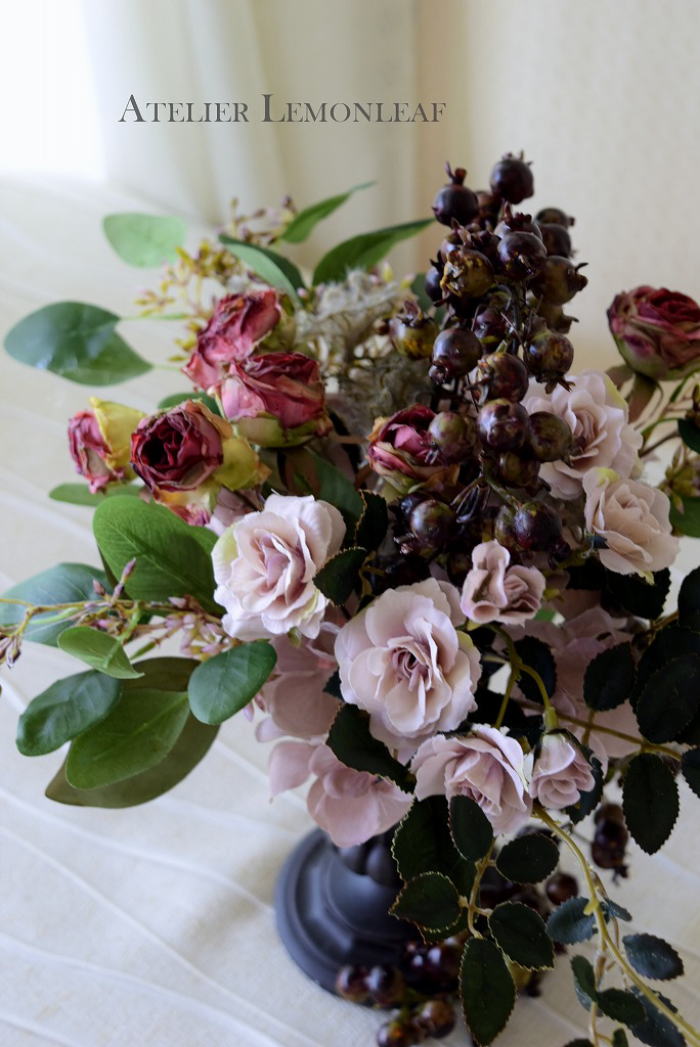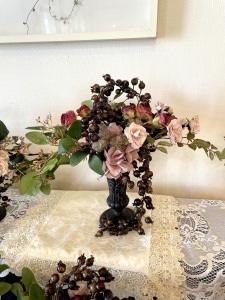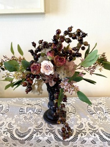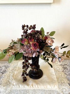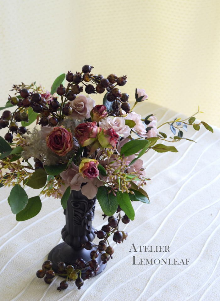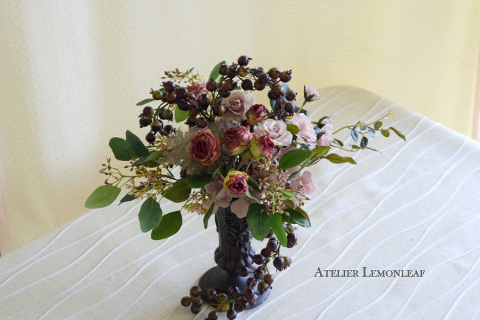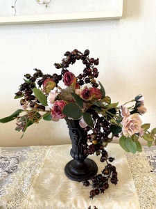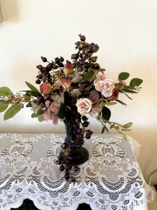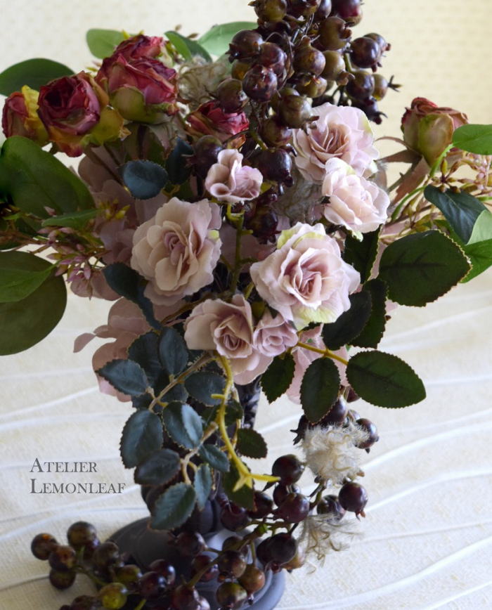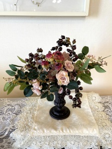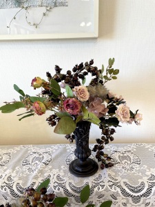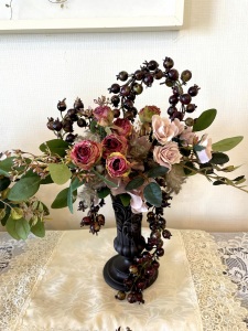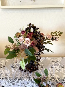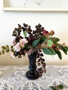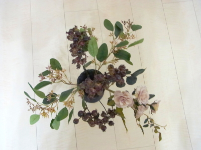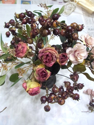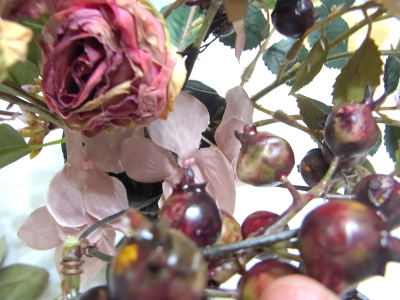 | ポイント とにかくフンワリと空間を取り込んだアレンジを この時点で足元は見えていて大丈夫です。後で紫陽花で添えますので。 バラと実がはいったら整えて、この位置でOKであれば、グルーを注入して固定します。 先程の花留めや、器の内側のへりなどにグルーで花材を固定します。 |