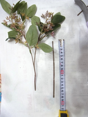 | ユーカリの茎を写真のように、2本とも18センチ程度カットします。 ポイント いかなるアーティフィシャルフラワーも輸送のために閉じています。使うときは、ユーカリの葉はしっかりひろげておきましょう。 |