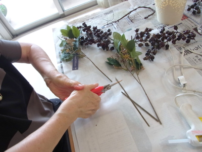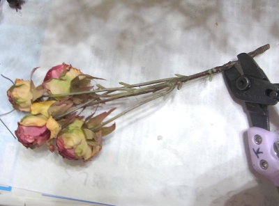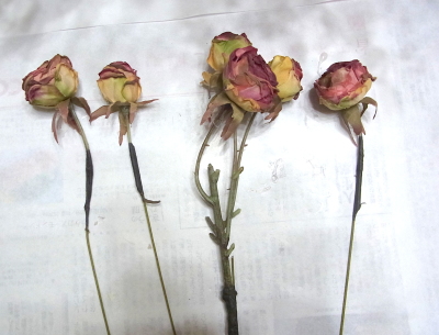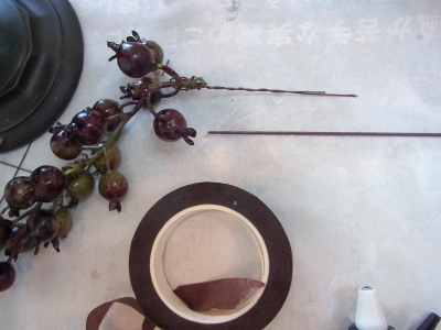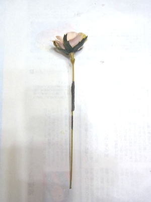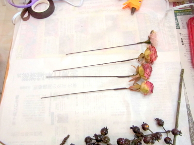 | お花を準備します。赤いバラの茎を1/2程度のカット、そこからさらに、3輪ほど小分けにして、それぞれに、1/2の太い方のワイヤーを、添木、テーピングします。 ポイント テーピングは写真のようにワイヤー同志が重なりあうところだけでOKです。下まで巻かないようにしましょう。 ワイヤーの素地がでているほうが、グルーが良く付きます。 |