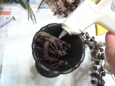 | 切り離したツルだけの部分を適宜まるめて器にセットして器の上部にグルーで固定します。 ポイント これが花留めの足場になります。あまり深く入れると役目をはたさないので、器の上部に、高さは淵より下に固定します。 一重で作るよりも、少しひろげて、もじゃっとふんわり広がるほうが、足場として便利です。 |
