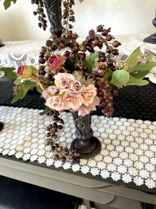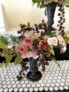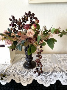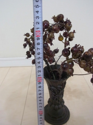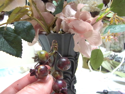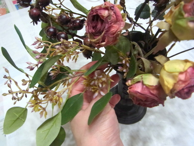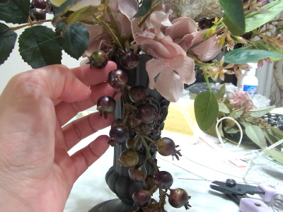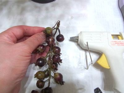 | さぁ!いよいよアレンジします。 実のピック二つを入れます、どちら一つかをトップにします。もう一つは傾けたり、前後させたりいろいろな位置に。 高さは写真をご参考になさってください。 |