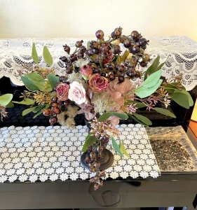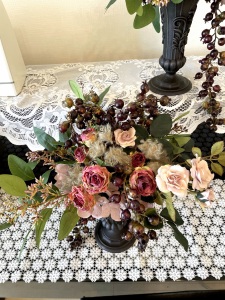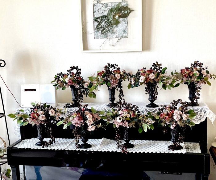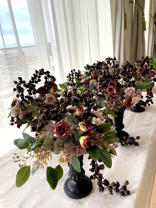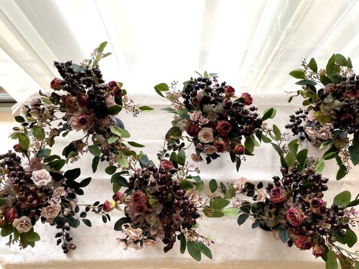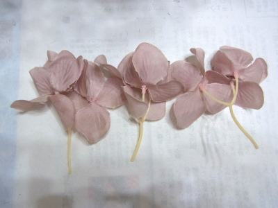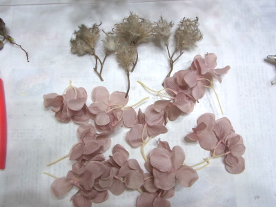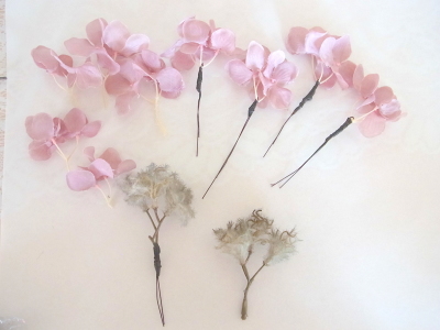 | 紫陽花とスモークツリーをを小分けにします。 紫陽花は必要に応じて、2~3輪づつワイヤリングしましょう。グルーをつけて足元に挿しこみます。 場所によっては、ワイヤリグせず、そのまま貼り付けてもOKです。 スモークツリーも小分けにして、足元や茎や葉にのせて、アクセントにします。こちらは軽いのでワイヤリングは不要です。 |
