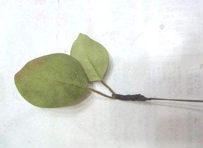 | 2本とも朝顔のつるのように、太いワイヤーに巻きつけ、これだけですと戻ってしまうので、さらに上から細いワイヤーをまきつけます。ます。 太いワイヤーの中央当たりにくるように止めます |
