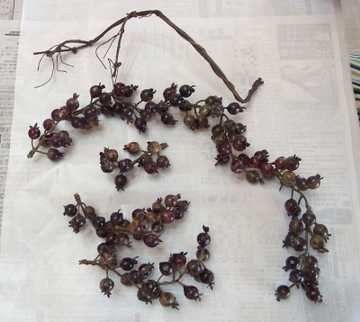 | 残った実はどうするかは皆さんの工夫で楽しんでくださいね! そのまま器のヘリの内側につけて下げることもできますし、添木してピックをつくって挿しこむこともできます。 最初につくった丸い輪状のピックをつくってもOK、いろいろ工夫してみてくださいね! さりげなく、器の脇に添えて飾ってもグッド。 |