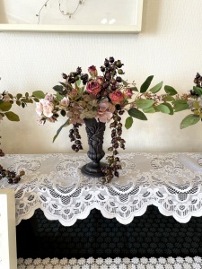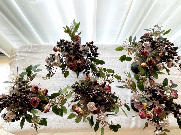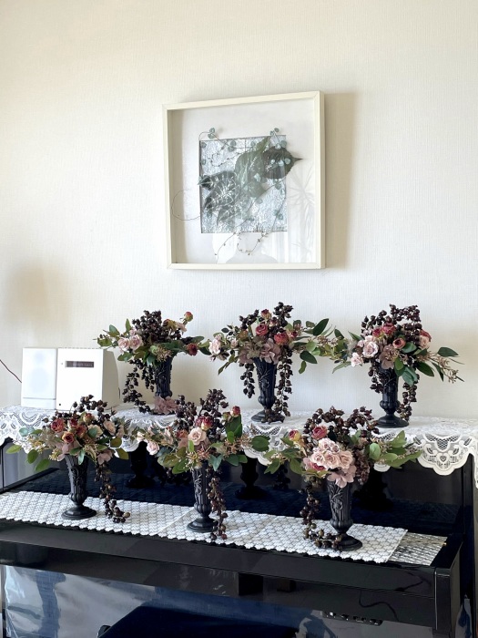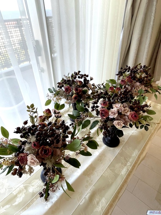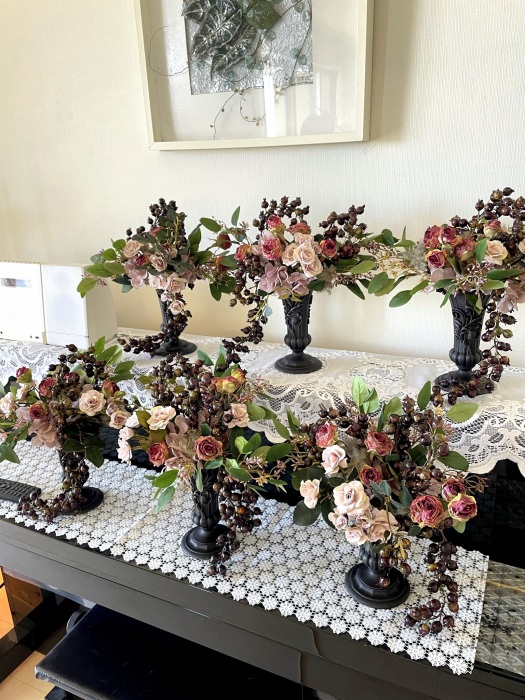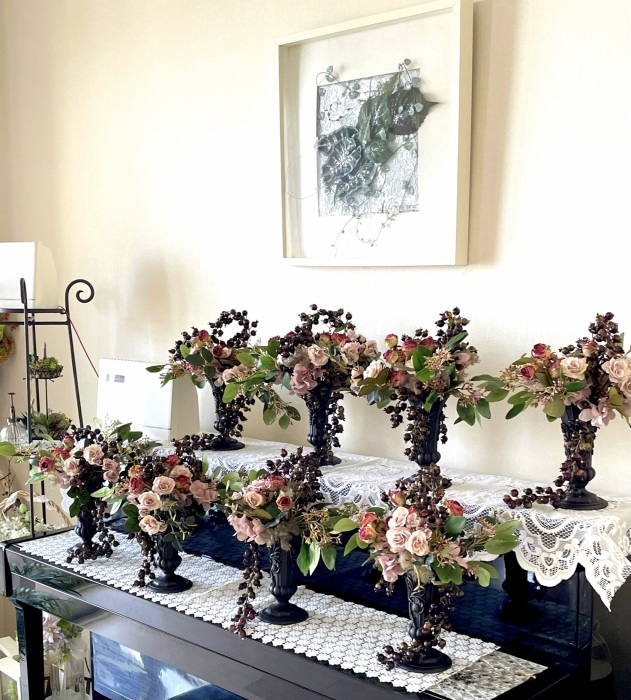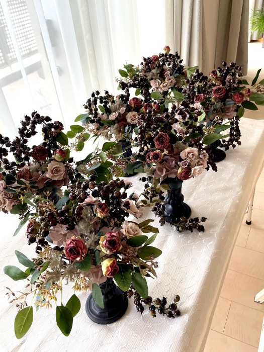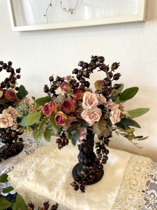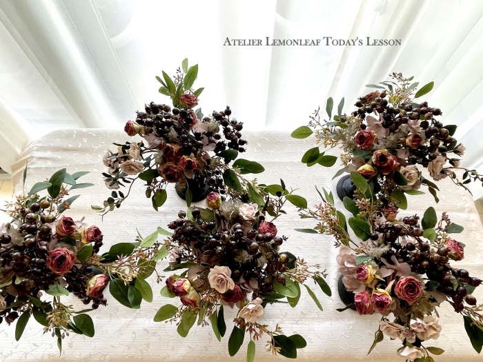 | バラ全部を好きな位置に全部いれましょう。 ポイント 真っすぐばかりにせず、いろいろな方向にカーブさせます。 あるいは実のリングのむこう側にも入れてみましょう。 ポイント アレンジは、最初にいれた高さのトップになっている実、三角形にいれたツル付きのピンクバラ ユーカリ二本の内側にアレンジします。 この三角形とトップの目安として、これらの先端を越さないようにすることで、非常にレイアウトしやすくなります。 |