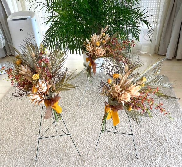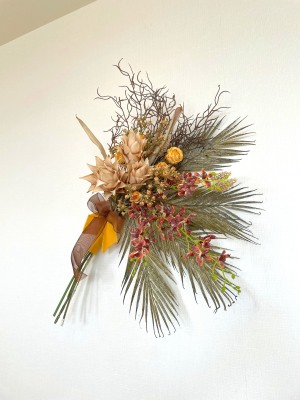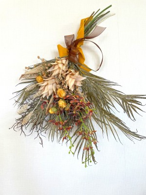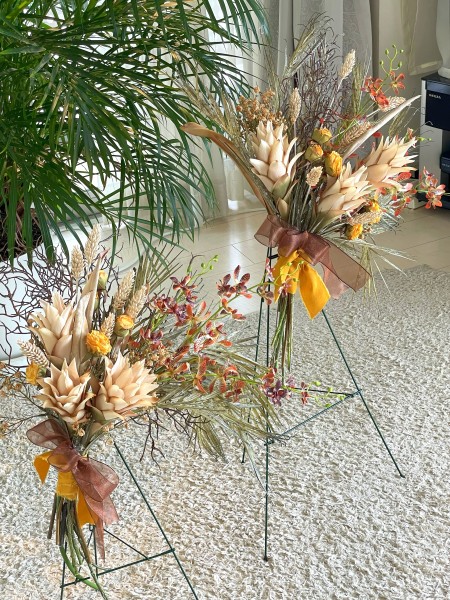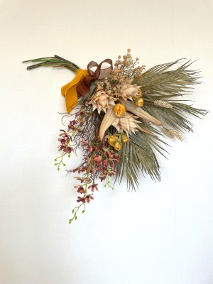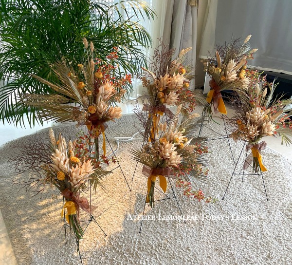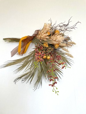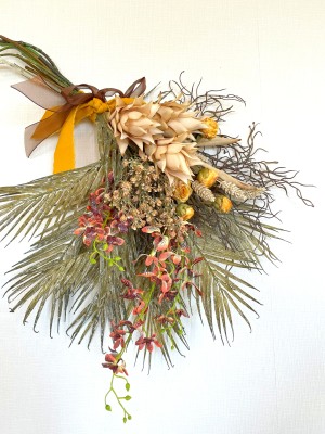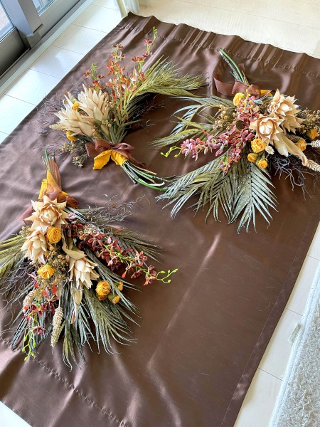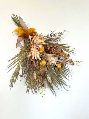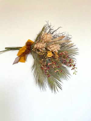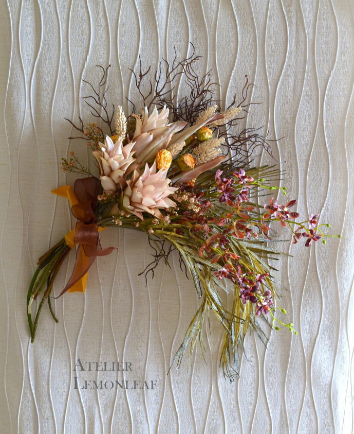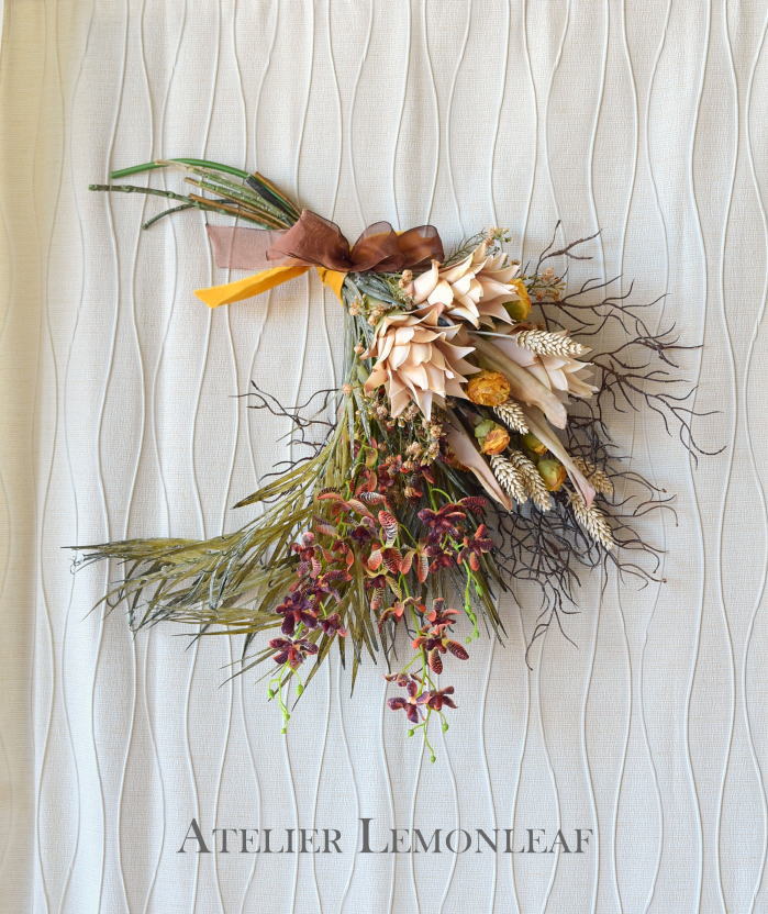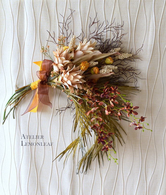 | こんにちは だいぶ外は暑さも和らぎ、秋の風情が感じられるようになりました。アジアン風のスワッグは夏をイメージするひとが多いので、実は秋バージョンはとてもレア、目にもフレッシュなデザインになりました。 その珍しいテイストだからこそ、作る人だけのお楽しみがまっていますね! では早速つくっていきましょう。 魔法のアシストリングで楽々アレンジです。セロテープをご用意ください。 デザインは自由です。バーム(葉)はストレートでもOKですし、サンプルのように右側にカーブさせてもOK。,あるいは、全体的に左右に扇子のように開くのも素敵です。 ぜひ、ご自身のシルエットをつくって楽しんでくださいね! ポイント バーム二本とも、しっかり、開ききましょう。アーティフィシャルフラワーは輸送上、どれも閉じた状態です。知らないでこのまま使ってしまう人が多いので、注意しましょう 必ず花材はフンワリさせて使う 覚えておいてくださいね! もうこれだけで、アレンジに空気がはいってナチュラルで素敵な仕上がりになります。 |