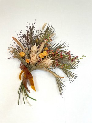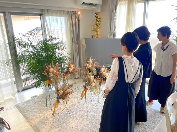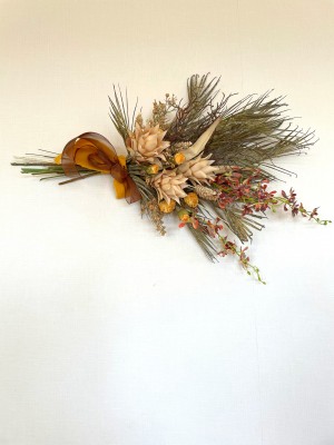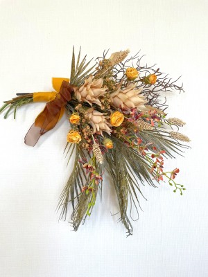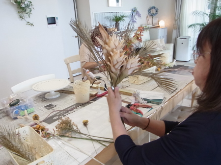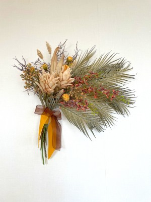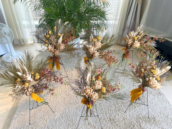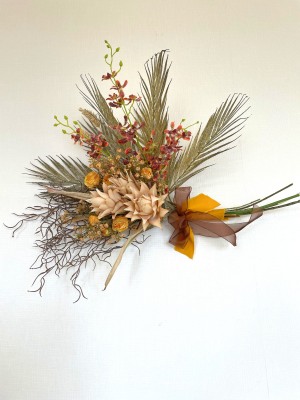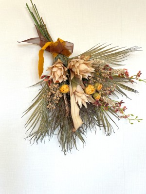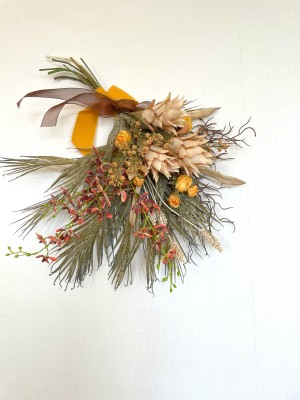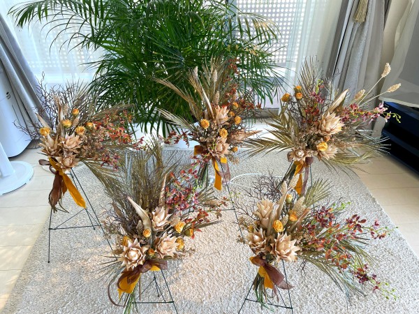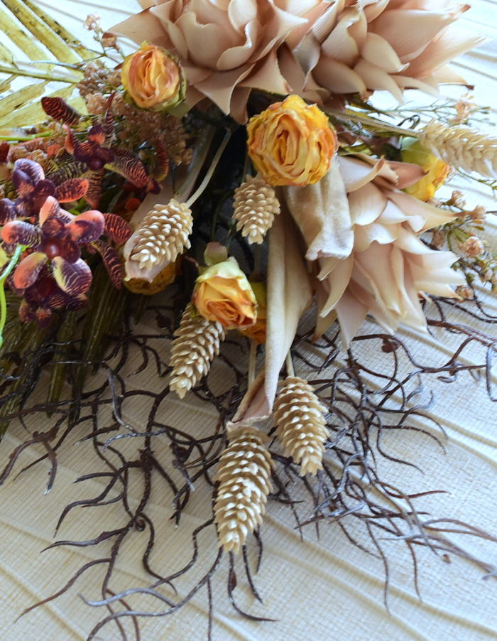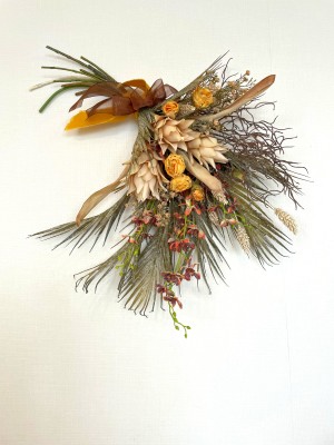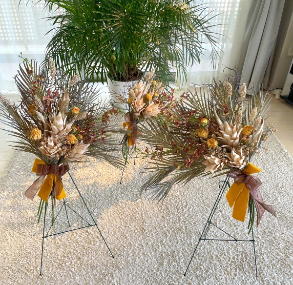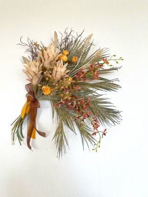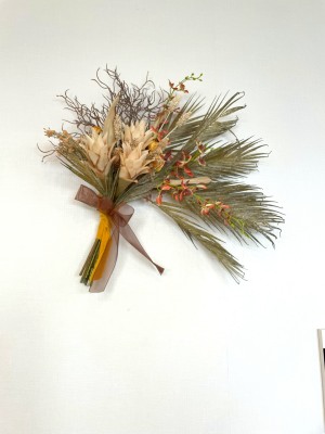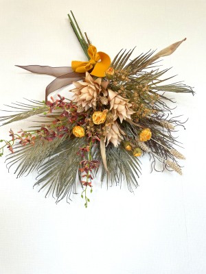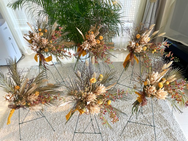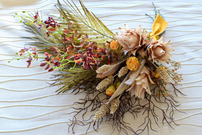 | こんにちは だいぶ外は暑さも和らぎ、秋の風情が感じられるようになりました。アジアン風のスワッグは夏をイメージするひとが多いので、実は秋バージョンはとてもレア、目にもフレッシュなデザインになりました。 その珍しいテイストだからこそ、作る人だけのお楽しみがまっていますね! では早速つくっていきましょう。 魔法のアシストリングで楽々アレンジです。セロテープをご用意ください。 デザインは自由です。バーム(葉)はストレートでもOKですし、サンプルのように右側にカーブさせてもOK。,あるいは、全体的に左右に扇子のように開くのも素敵です。 ぜひ、ご自身のシルエットをつくって楽しんでくださいね! ポイント バーム二本とも、しっかり、開ききましょう。アーティフィシャルフラワーは輸送上、どれも閉じた状態です。知らないでこのまま使ってしまう人が多いので、注意しましょう 必ず花材はフンワリさせて使う 覚えておいてくださいね! もうこれだけで、アレンジに空気がはいってナチュラルで素敵な仕上がりになります。 |