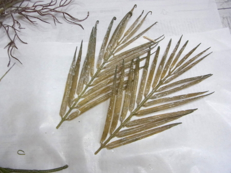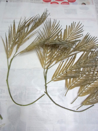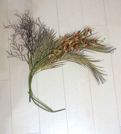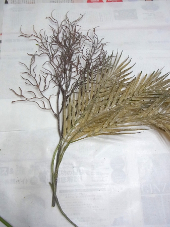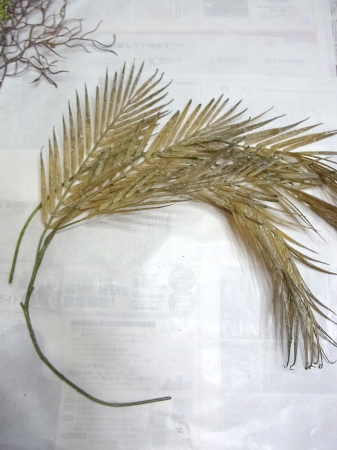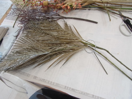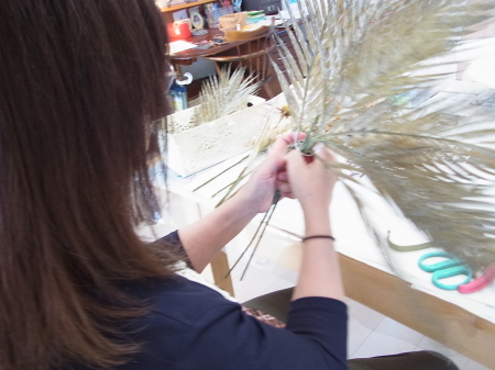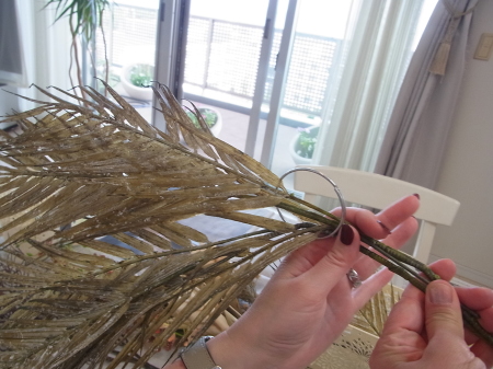 | それぞれの バーム1本から、一番下の葉をカットします。 この2枚は最後に使うのでとっておきましょう 写真のバームは1本から二枚カット、していますが、いきなりここまで少なくしなくても あとで、重そうにみえたら、適宜カットしてください。 茎をカーブさせているのは、右側に寄せたいデザインだからです。 |