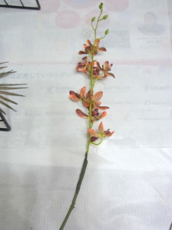 | このおしゃれな色の蘭はなかなか、手に入らない色です。したのほうを一本カットして、ワイヤー1本を添木しておきましょう。 テーピングは茎とワイヤーが重なるところだけでOKです。フラワーテープはグルーが付きません、出来る限り少ない方がベターです。 テーピングしたあと、お花を上下にスライドさせるときに、茎の方をもちましょう。 お花をもつとすっぽ抜けてしまいます。 |