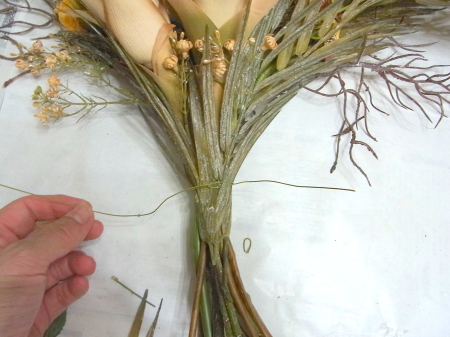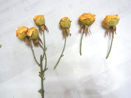 | 欄と同じ要領で、バラも小分けにして、茎は3~4センチにカットして、添木とテーピングをします。 あるいはアレンジの場所によっては、添木いらずで、このままグルーでつけてもOKです。 |