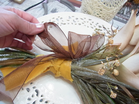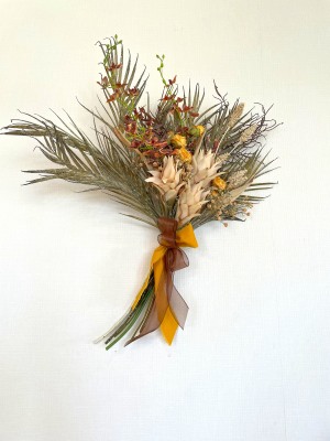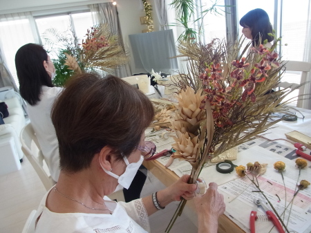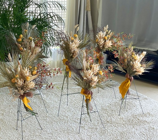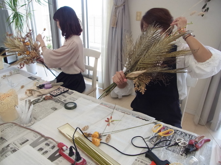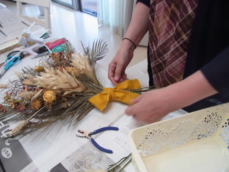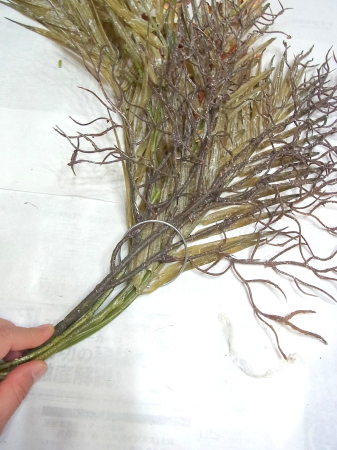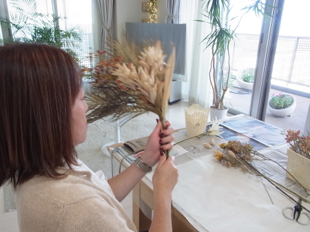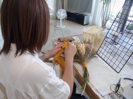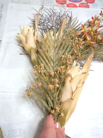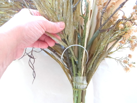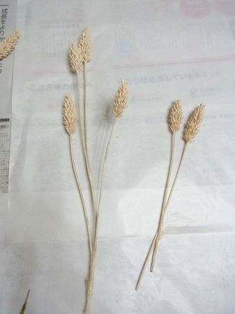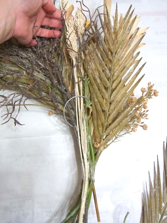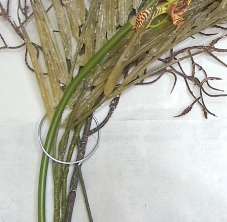 | 小麦風の花材は下から二本だけカット、添木はリングの持ち手に届かない場倍だけ必要に応じ、施しましょう。 ポイント アレンジの制作に入る前に、必ず、一度、全部の花材を手に持ってみましょう。 決定ではありませんが、実際に、量的なもの、質感を感じてください。。 これをせずいきなり、レイアウトしてみても、やはりイメージがわかないものなのです。 |