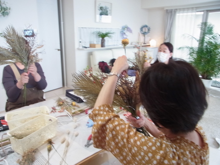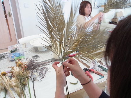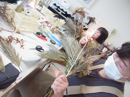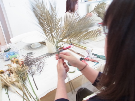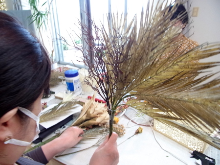 | 位置を見定めています。バーム二本、黒枝、これが背景のベースになりますので、これらはしっかりとセロテープで固定します。 | |