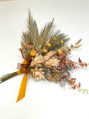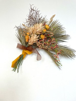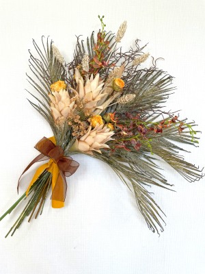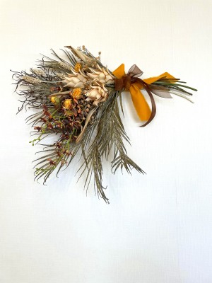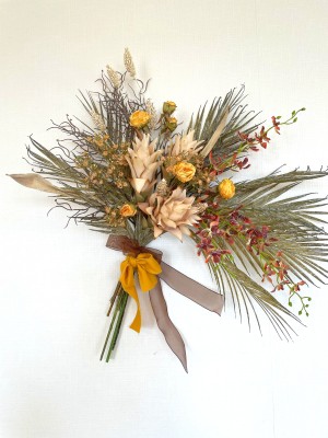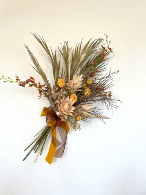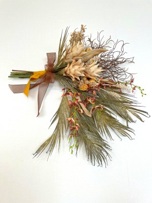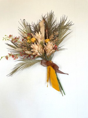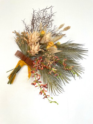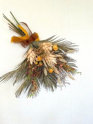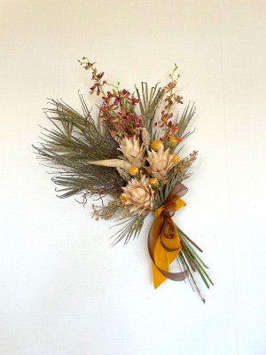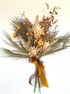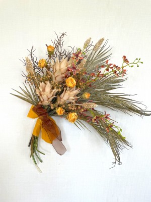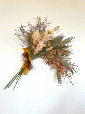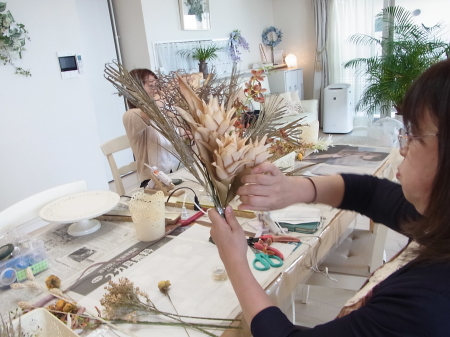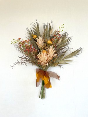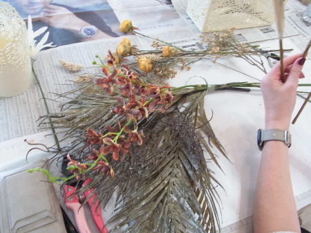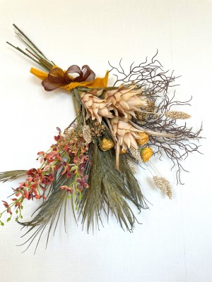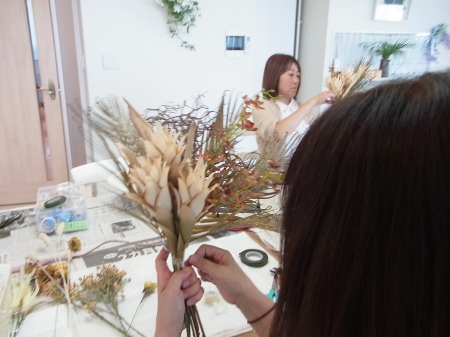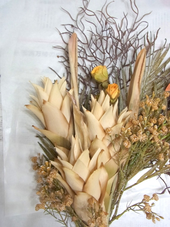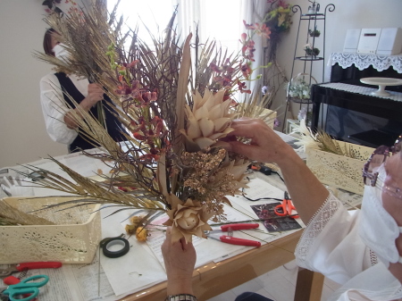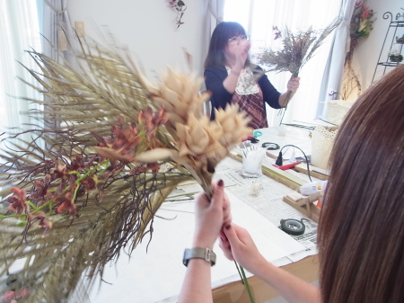 | プロテアがはいったら、残りの花材全てを魔法のアシストリングの輪をめがけて、上からさしたり、脇から挿したり、背面からさしたりして、上下させながら、いい場所をみつけて、持ち手にとめていきます。 あるいは正面から添えることもあります。 前からみて、いい場所をさがしてくださいね。 正面からみて奥の方に入れたい時きは、背面から挿した方が綺麗にできます。 間引いた葉やお花は丈が短いものは、グルーでも十分固定できます。 |