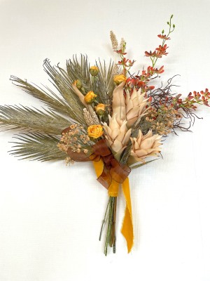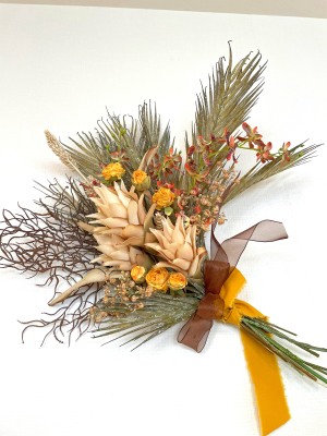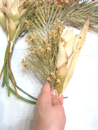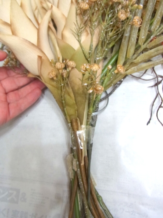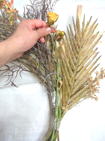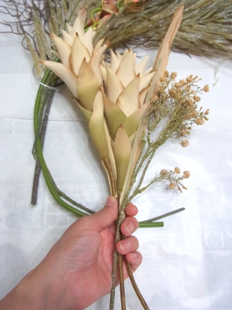 | 欄がはいったら、プロテア3本を、リングを通さずに正面からそえて同じ場所でテープで持ち手にとめます。 サンプル実の付いた花材も少量一緒に前から添えてとめています。 ポイント 正面にくる花材はリングに通さず添えたほうが前面に来て良い表情になる場合があり、ケースバイケースです。 実がついた花材を正面ではなく間や脇につかうときはリングに通しましょう、断然安定します。 |
