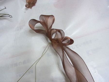 | 茶色のリボンはワイヤーでカタチができたら、ワイヤーは短くカットして、グルーで固定します。 理由はハイウエストにしたいからです。 ポイント 写真のように限りなく上のほうに貼り付けましょうとっても綺麗にみえます。 |