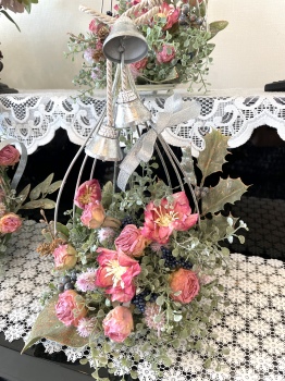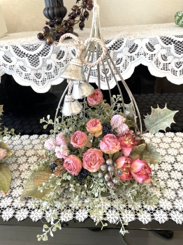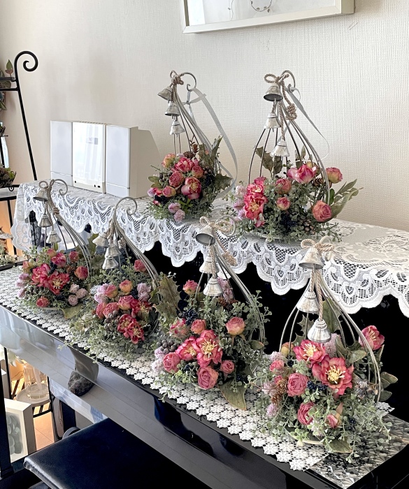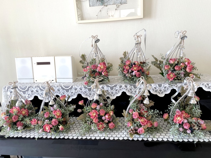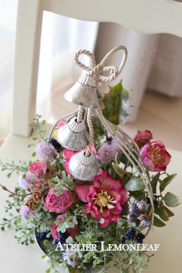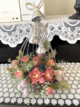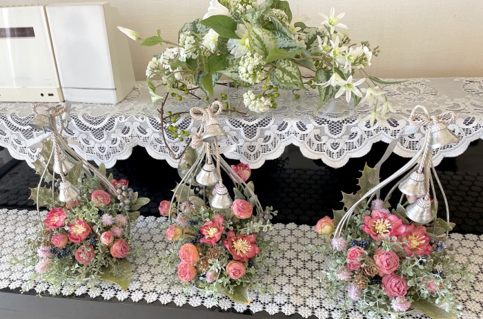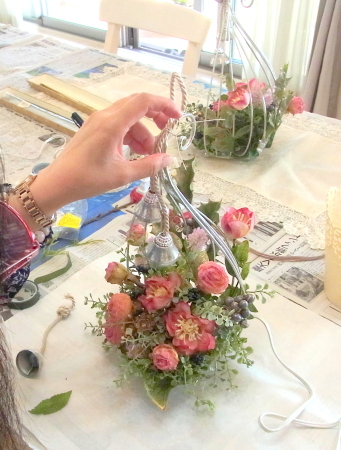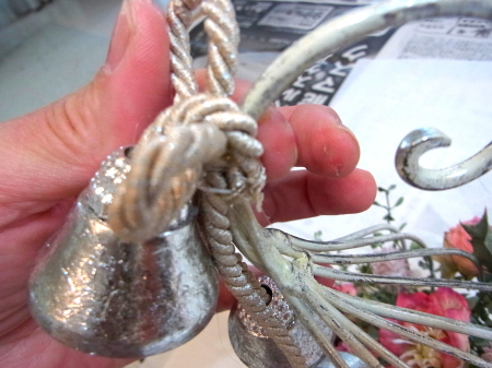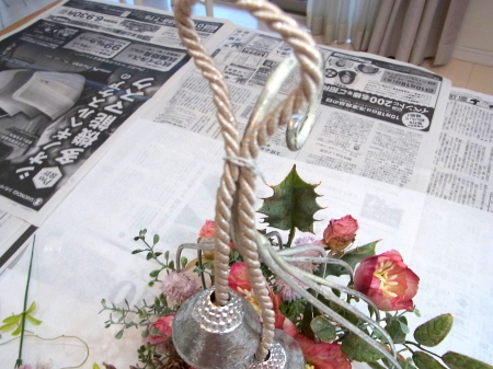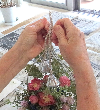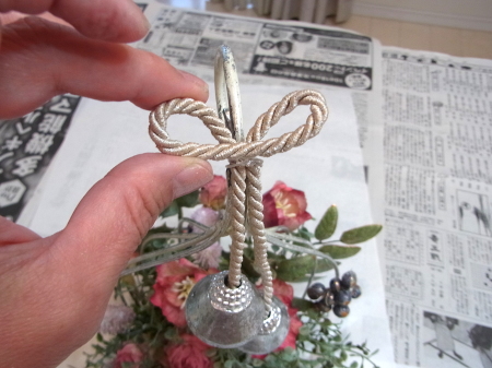 | お花とリーフがはいったらベルを付けましょう。 ベルをほどきます。 とても固く結ばれていますが、一番長いものを↓にグッと引っ張ると比較的簡単に外せます。 一本の両端にベルがついている紐とベルが一つついている紐に分かれます。 |